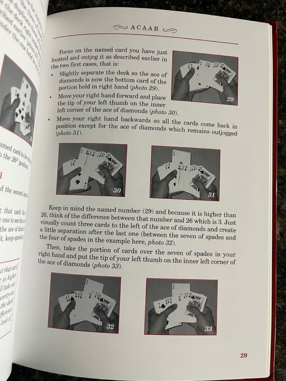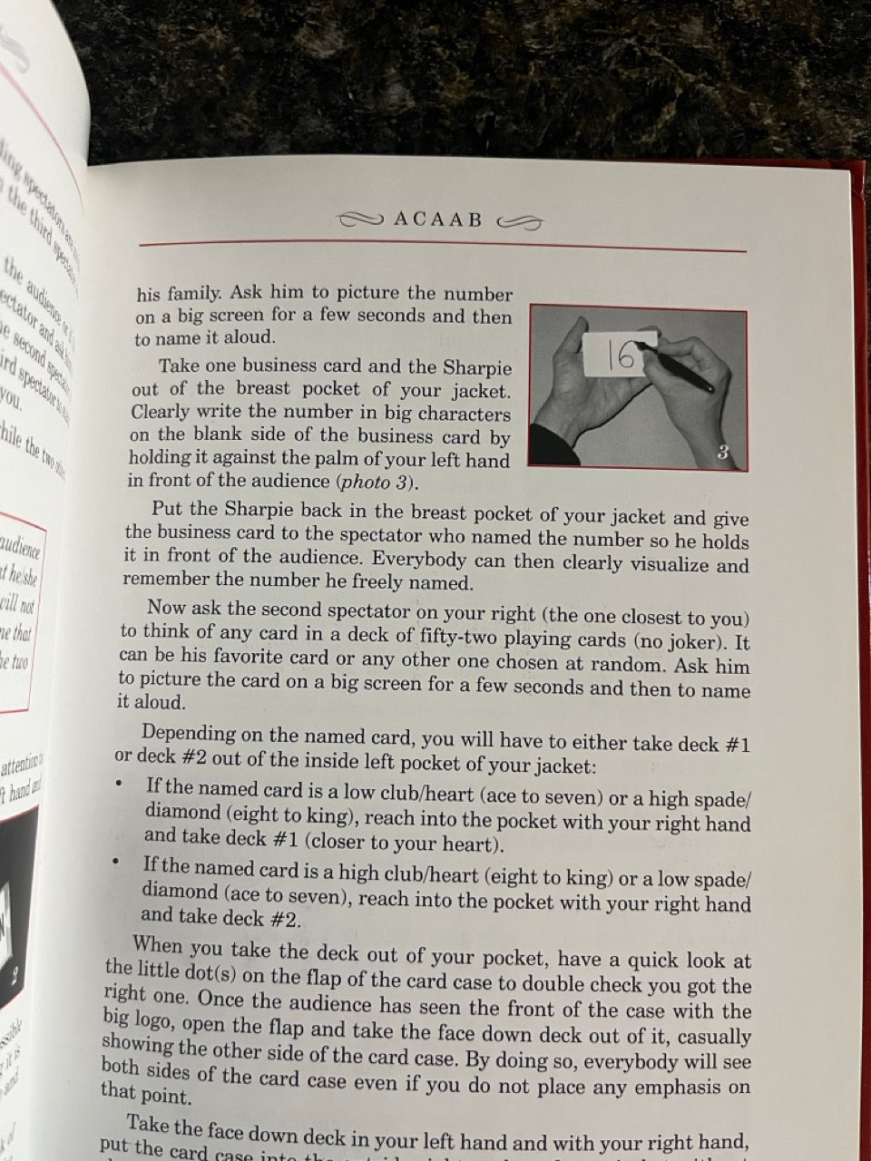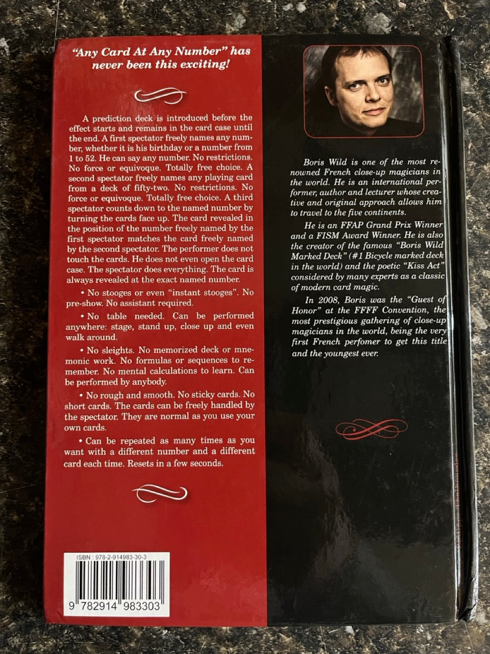 A prediction deck is introduced before the effect starts and remains in the card case until the end. A first spectator freely names any number, whether it is his birthday or a number from 1 to 52. He can say any number. No restrictions. No force or equivoque. Totally free choice. A second spectator freely names any playing card from a deck of fifty-two. No restrictions. No force or equivoque. Totally free choice. A third spectator counts down to the named number by turning the cards face up. The card revealed in the position of the number freely named by the first spectator matches the card freely named by the second spectator. The performer does not touch the cards. He does not even open the card case. The spectator does everything. The card is always revealed at the exact named number.