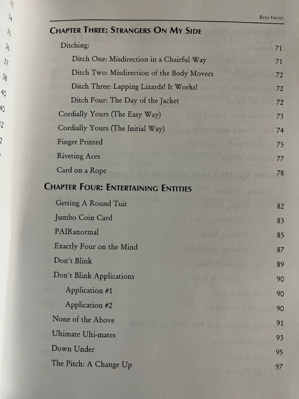 Meet Ron Frost. He’s the genius behind some of the most popular packet tricks of our time. Recently, however, Ron discovered that there are 46 more cards in the deck, and he hasn’t slept a wink since! In this, Ron’s first major book, he tips the card magic that has earned him both his reputation and his living for decades! Once Ron has a card chosen, anything is possible! Transformations, transpositions, transmutations, and they’re all here, including:
