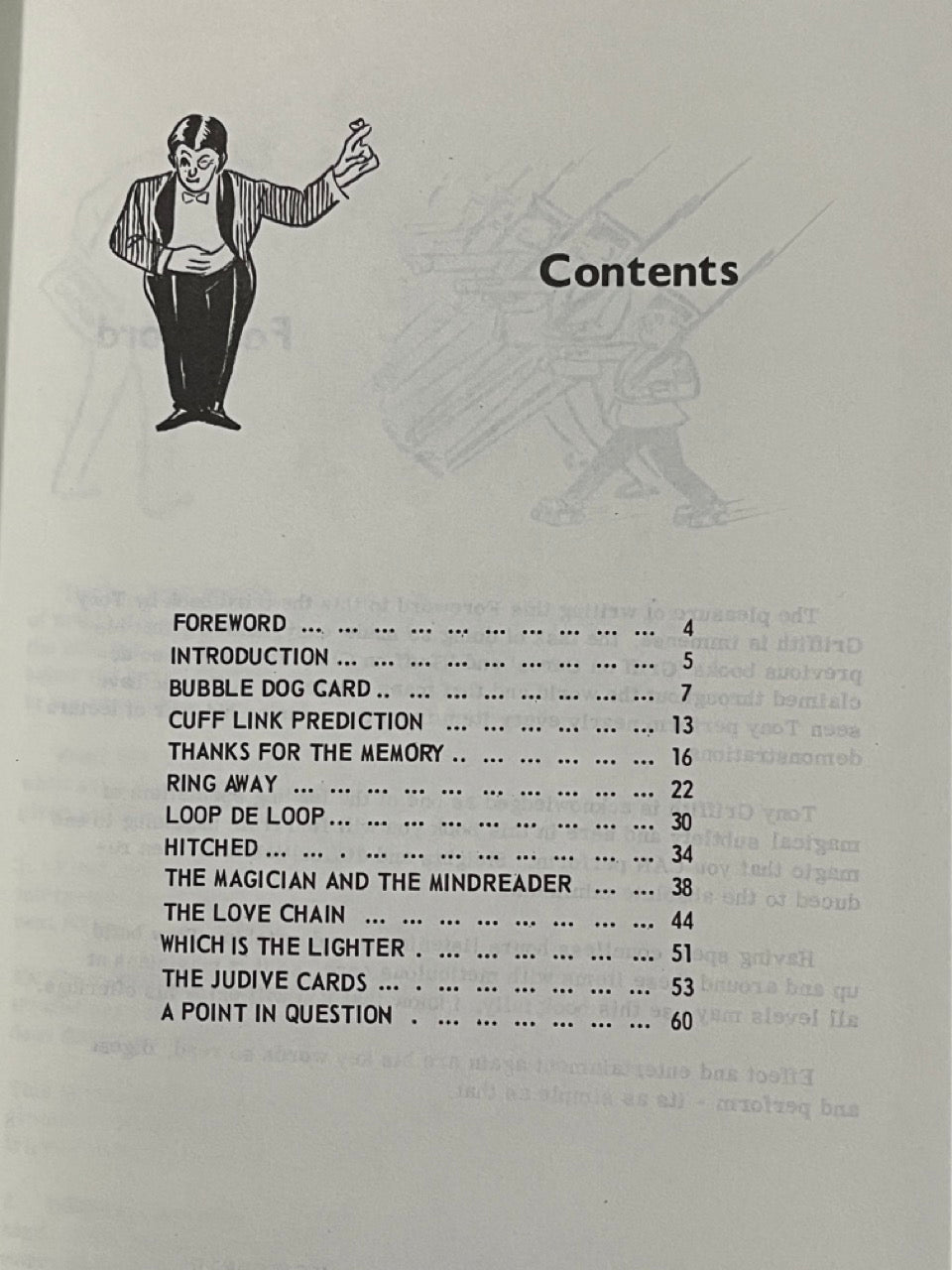 In this book Tony Griffith shares with us some of his best routines. There is something for everyone. You can find card magic (both close-up and stand-up), entertaining mentalism and stage magic. All effects are easy to prepare and easy to perform. Interesting background information and useful notes are provided for every trick.