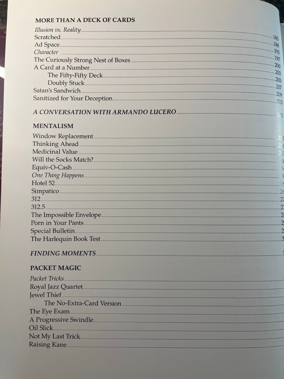 Bills, beer, socks, envelopes, DVDs, coffee cups, baskets, boxes, borrowed rings, portable darkness, pieces of paper, paperback books, a bulletin board, a glass canister, a wand, a pencil, and a marshmallow...plus Cards & Coins.