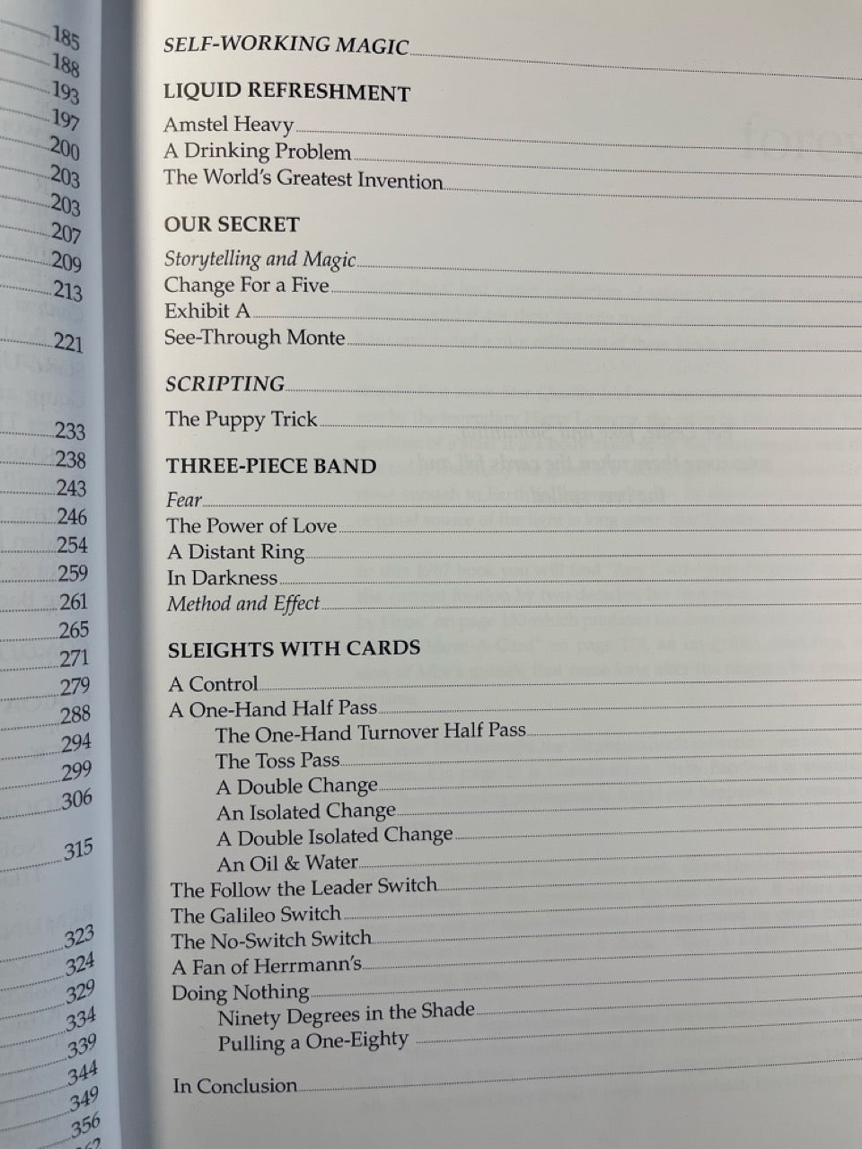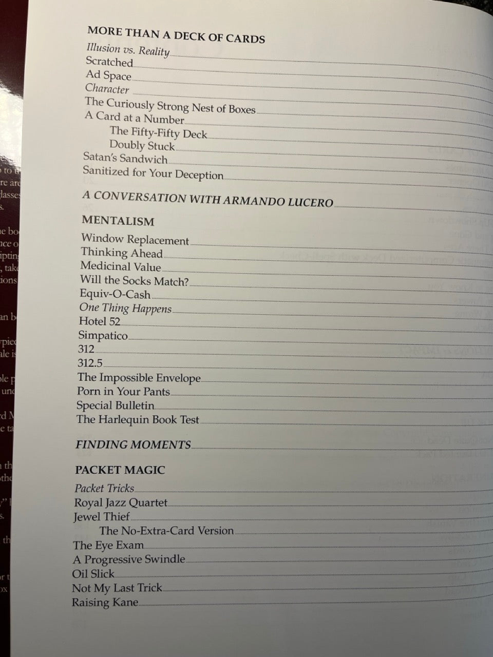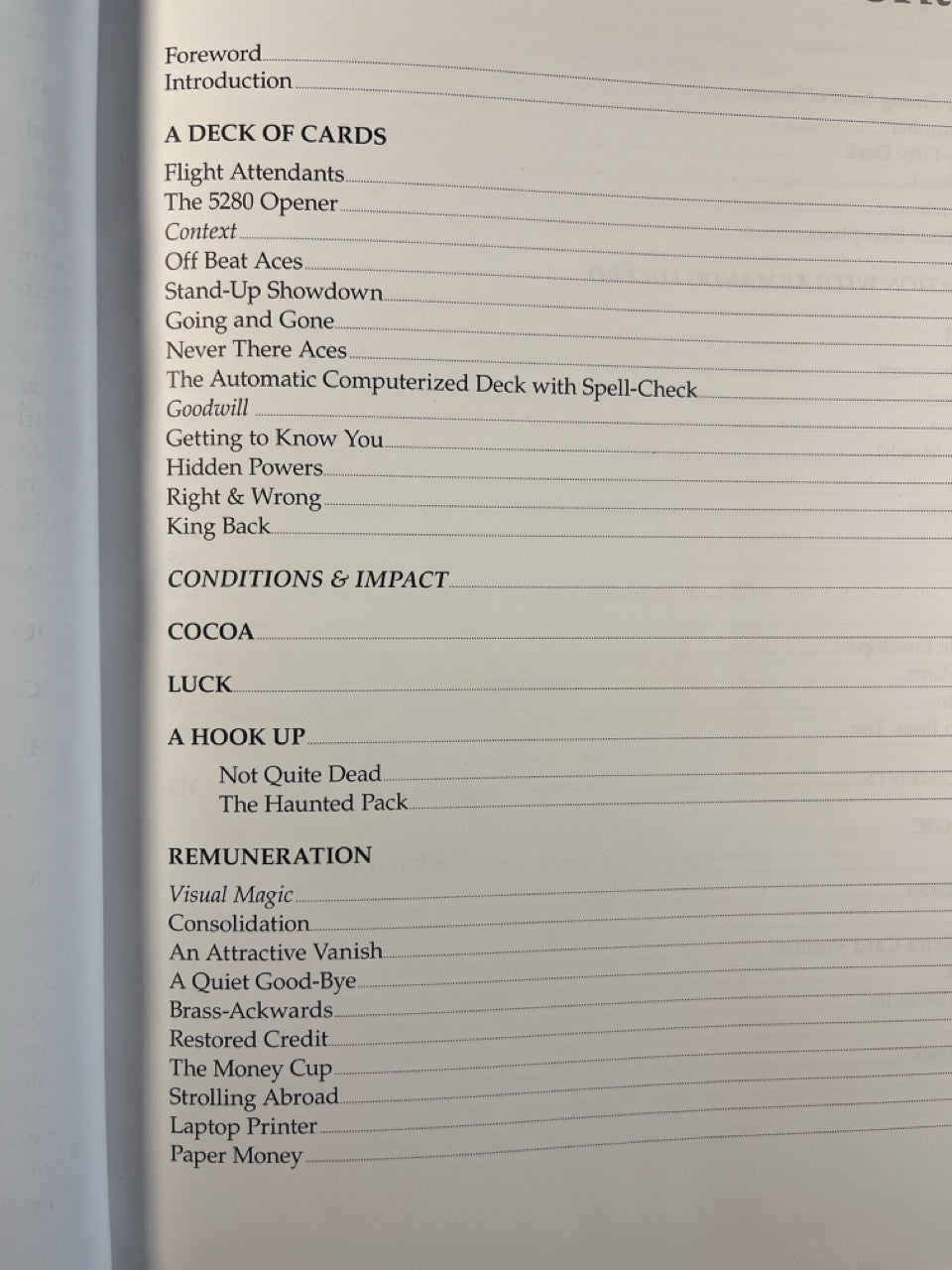 Bills, beer, socks, envelopes, DVDs, coffee cups, baskets, boxes, borrowed rings, portable darkness, pieces of paper, paperback books, a bulletin board, a glass canister, a wand, a pencil, and a marshmallow...plus Cards & Coins.