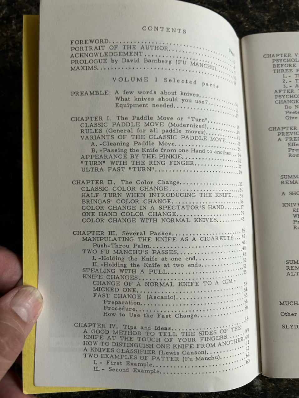 Techniques and routines include: Classic Paddle Move (Modernized), Cleaning Paddle Move, Passing The Knife From Hand To Hand, Appearance By The Pinkie, Turn With The Ring Finger, Ultra Fast Turn, Classic Color Change, Ascanio's Half Turn, Bringas' Color Change, Ganson's Color Change In A Spectator's Hand, One Hand Color Change, Color Change With Normal Knives, Manipulating The Knife As A Cigarette, Push-Through Palm, Two Fu Manchu Passes, Stealing With A Pull, Change Of Normal Knife To A Gimmicked One, Ascanio's Fast Change, To Tell The Sides Of The Knife By Touch, A Knives Classifier, Three Psychological Procedures, Psychological Aspects Of The Color Change, A Fred Kaps Routine, The Handkerchief Pass, A Short And Easy Routine, Ascanio's Knives And Color-Blindness and much more.