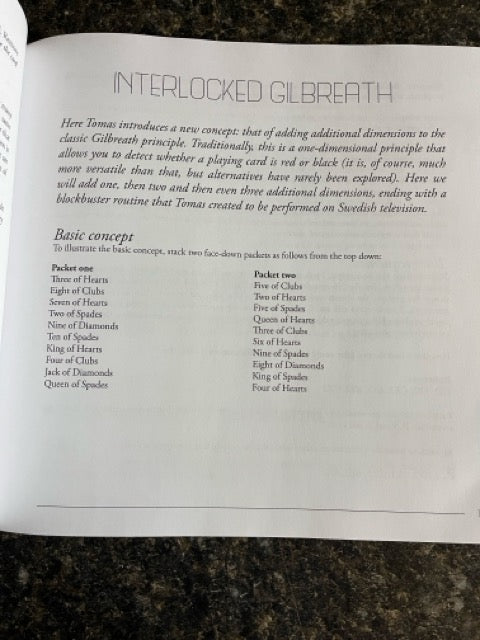 Sleight of hand fans are in for a treat as the book is full of new effects and techniques. In particular, pay attention to Tomas' work with the spread double lift: this refined technique has been used by card magic's elite for many years and it is finally published here, for the first time, along with five effects using it.