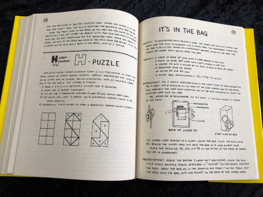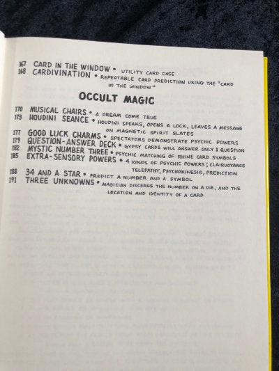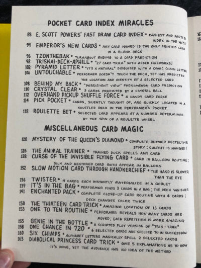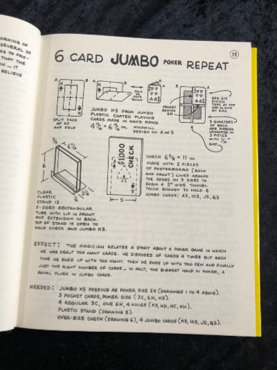 Contents include 7 The Hard Way, the spot card effect in the shape of a die; Let's Make A Deal Dollar Bill in Lemon, in which you trade a dollar bill for the contents of a locked box. His bill is burned, then found inside a lemon inside the locked box!; Fast Draw Card Index; Curse of the Invisible Flying Card, an amazing card and silk in balloon routine; Cut & Restored, in which a piece of rope is placed inside a folded magazine page. The paper and rope are cut in two. The halves are brought together and both rope and magazine end up restored. Plus Houdini Seance; 3 Cup Monte; Slow Motion Card Through Handkerchief; Track Record Revised; Game of Darts; Knot Tying Demonstration; Untouchable; Tic-Tac-Toe for Two; Animal Trainer; One Chance in 720; Bang Rope; Texas Poker; and more and more and more!