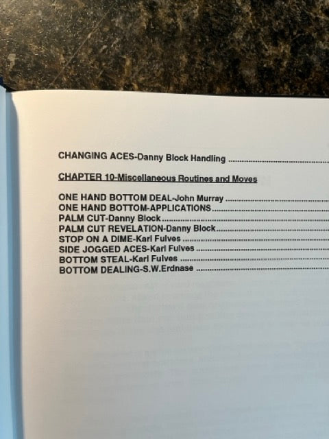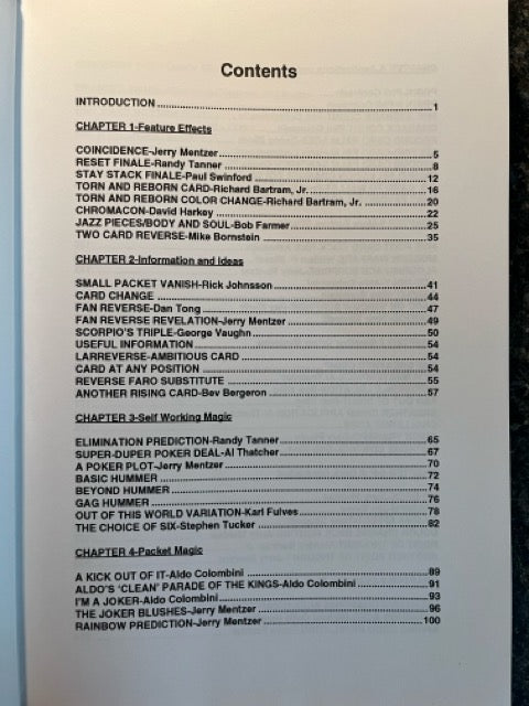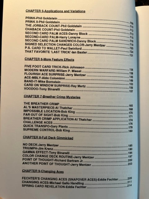CHAPTER TITLES – Feature Effects – Information and Ideas – Self Working Magic – Packet Magic – Applications and Variations – More Feature Effects – Breather Crimp Mysteries – Full Deck Gimmicked – Changing Aces – Miscellaneous Routines and Moves.