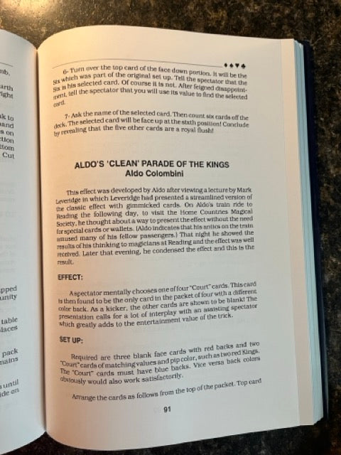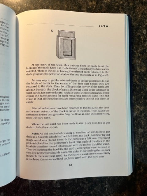 The magic ranges from self-working tricks to more advanced magic requiring skill. Most of the items are previously unpublished and most can be performed with ungimmicked playing cards. Profusely illustrated with clear line drawings. In addition to the author’s own tricks and routines, many other clever card magicians have also contributed to the book.
