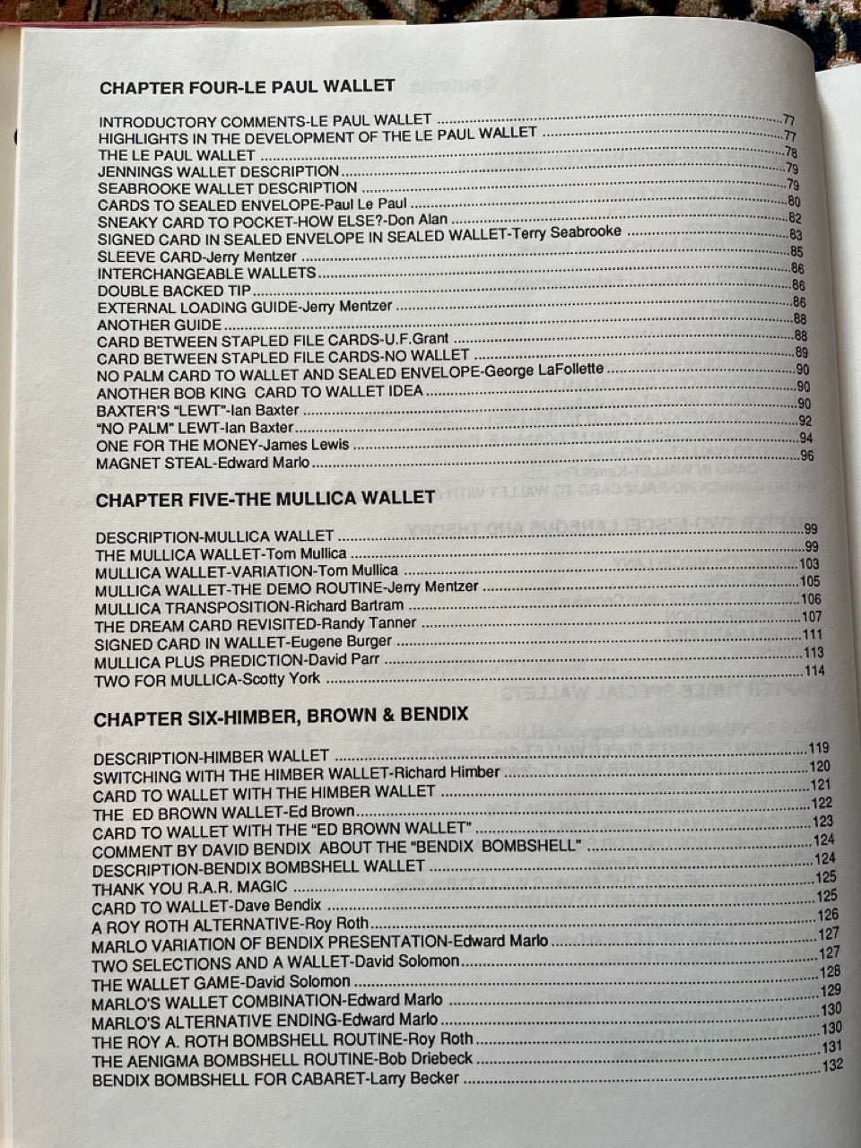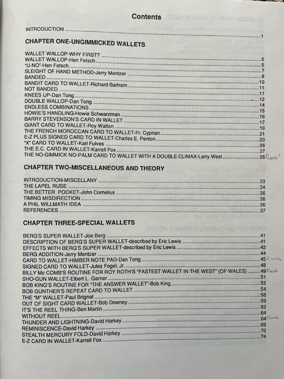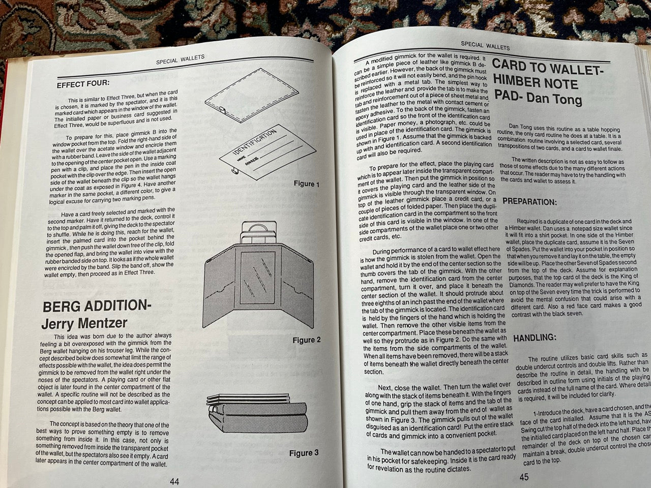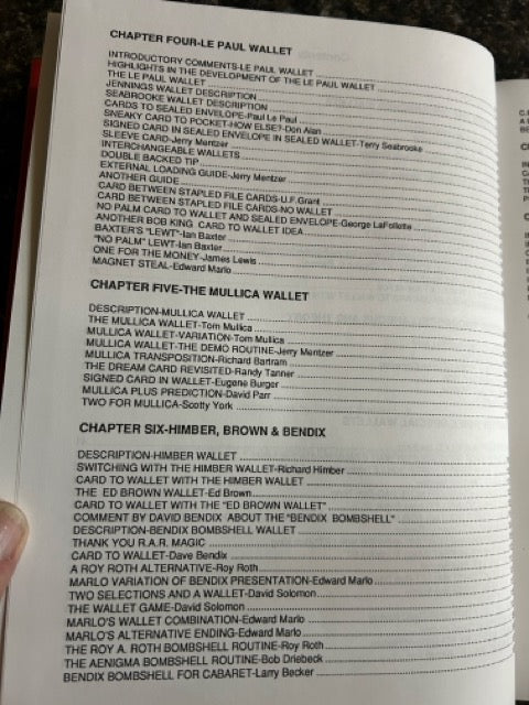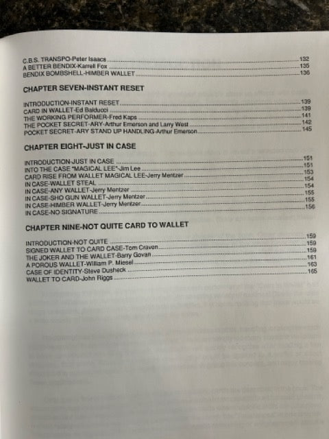 The Card to Wallet effect is one of the strongest possible close-up effects with cards. Properly performed, it is incomprehensible to spectators. Ungimmicked wallets are featured in one large chapter of the book. Other chapters are devoted to many of the fine gimmicked wallets available including Himber Wallet, Mullica Wallet and LePaul Wallet. Methods described range from those requiring virtually no skill to more advanced methods that require familiarity with basic card handling methods.