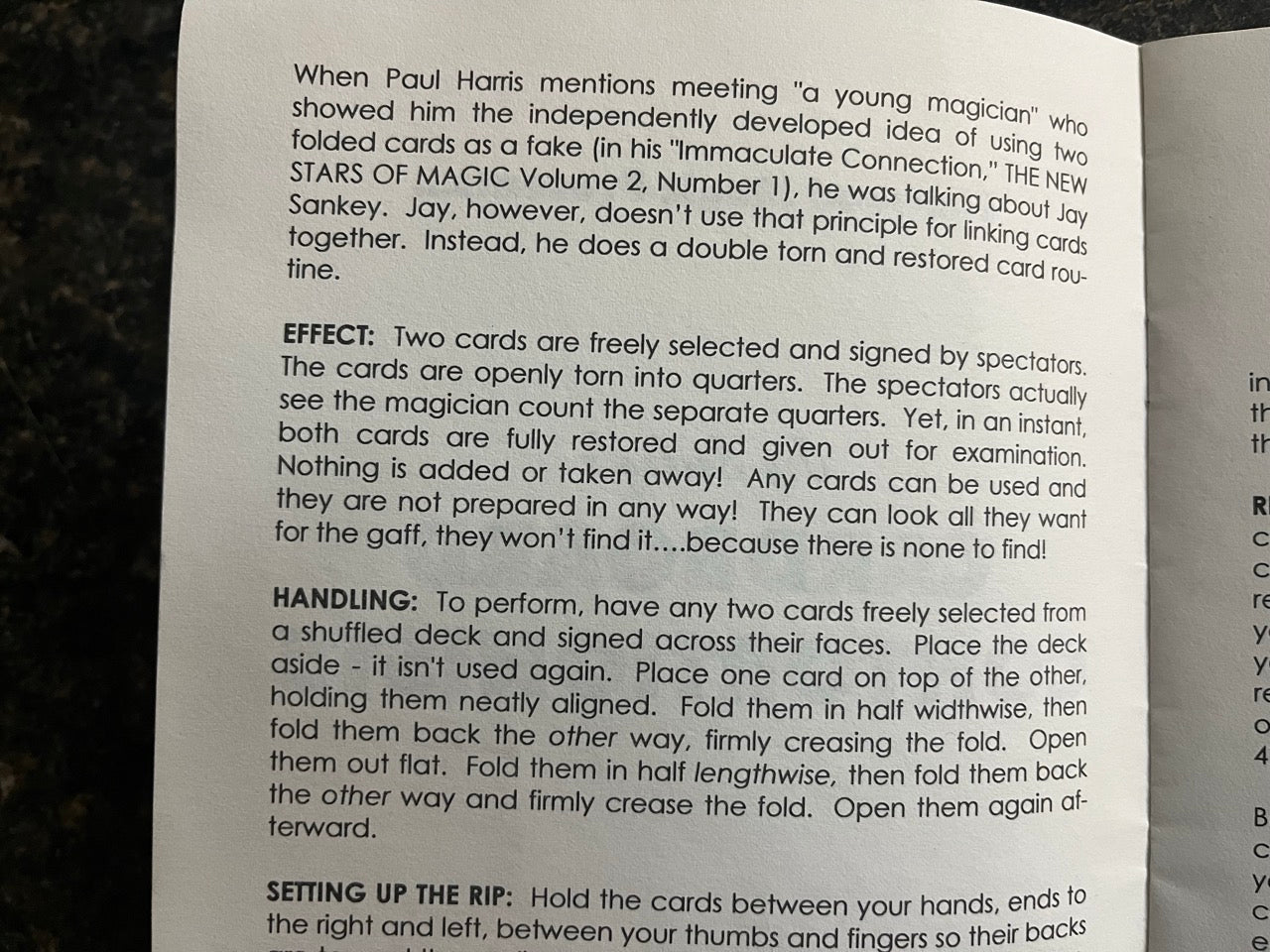 Two cards freely selected and signed by the spectators. The cards are openly torn into quarters. The spectators actually see the magician count the separate pieces, yet in an instant both cards are fully restored and given our for examination. Nothing added, nothing taken away. Any cards can be used and they are not prepared in any way! They can look all they want for the gaff, they won't find it...because there is none to find.