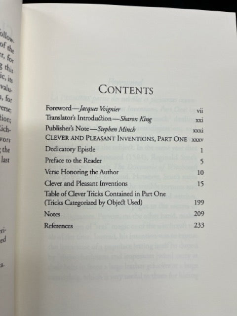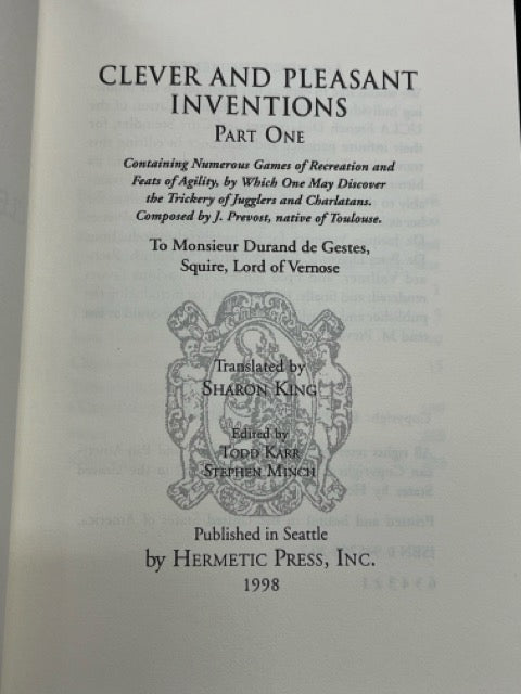 Published in France in 1584, Prevost's Clever & Pleasant Inventions is the earliest known books completely devoted to conjuring's secrets, and one of the very rarest. Unfamiliar to all but a few, even in France, the complete text of this landmark of conjuring literature has been meticulously translated into English and copiously annotated. Ever wonder what tricks and methods your magical ancestors knew and used over 400 years ago? You are in for some surprises. 84 tricks, feats and stunts are described in painstaking detail by Prevost in his masterwork. Over 250 pages, designed and typeset in close simulation to the French original, this important volume is being produced in a deluxe edition of only 700 copies, sure to please both the student of magic and the bibliophile.