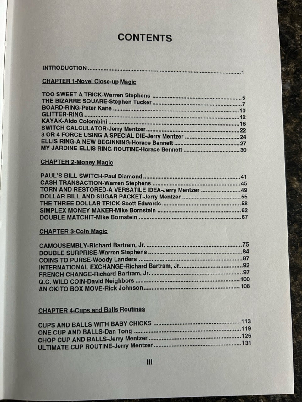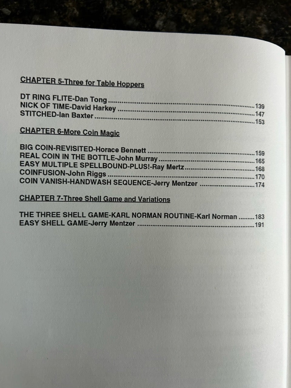 A big book with 195 pages, hard bound with a two-color dust jacket. The book contains many novel close-up effects. None use playing cards except as incidental props. Most are previously unpublished and are worked with simple props which the reader can make up, or is likely to have on hand already.
