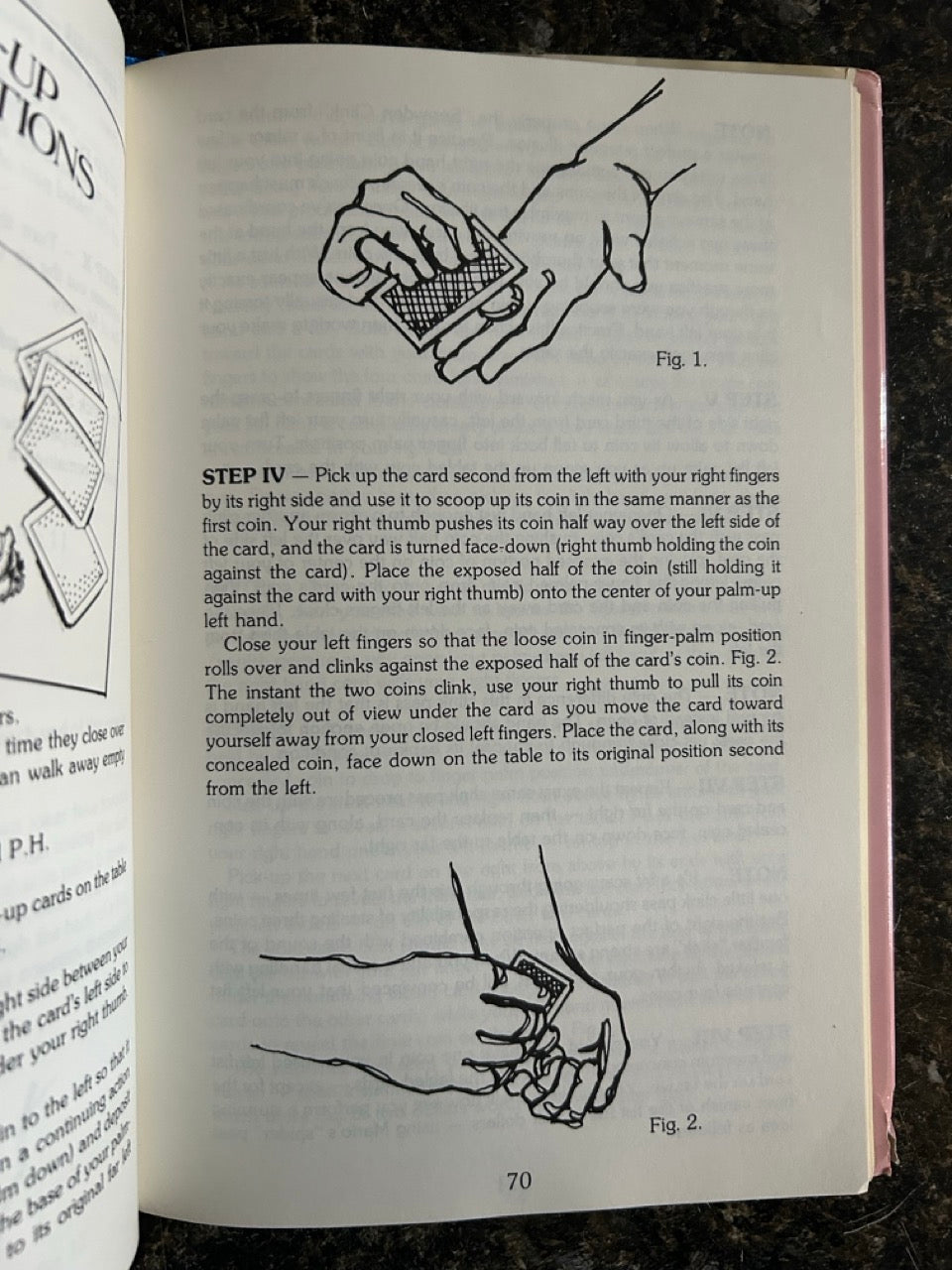 Deja Vu (Mike Giles, Pat Snowden, Dana Betz, Paul Harris): Four half dollars placed in the hand disappear and reappear underneath four cards on the table.