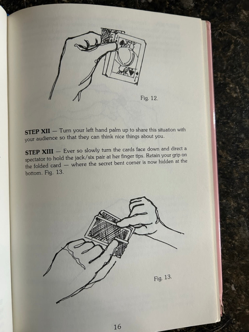 Seductive Switch: Ace folded into a small packet, Six and Jack shown, Ace invisibly unfolds & changes places with the Six to form a perfect
