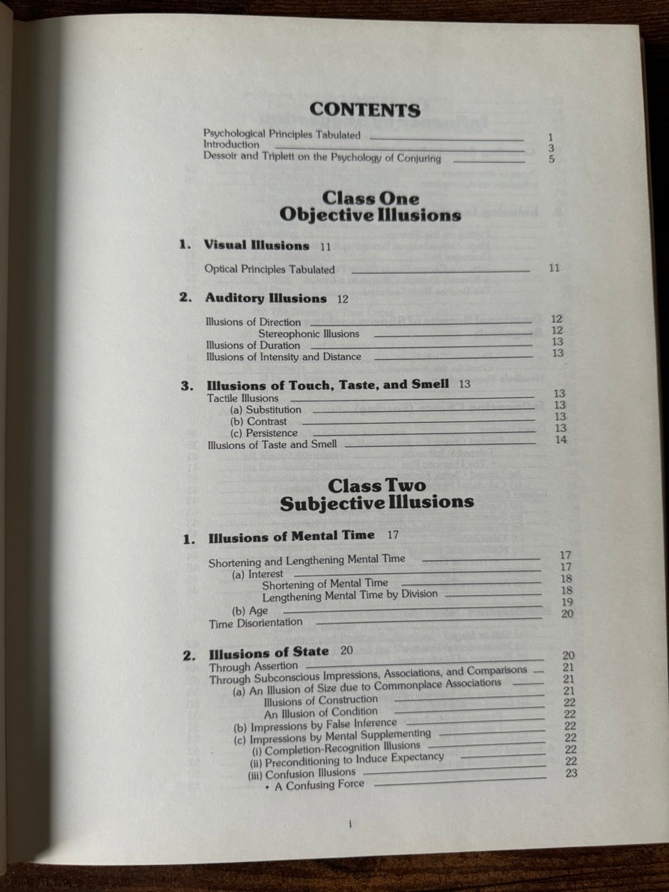 This book by S.H. Sharpe presents the classifications, principles and examples of important psychological techniques every magician should know about. The author has identified four Fundamental Principles (Objective Illusions, Subjective Illusions, Influence by Suggestion, and Intellectual), with fifteen Specific Principles as Sub-topics within the major classes. In addition to the basic principles and their historical use, there are extensive examples of memorization aids and Key Word Charts. Two sequences for the Knight's Tour are presented, along with the Key Word Charts. Tips on transmitting numbers and words to a confederate are also detailed. Appendices deal with Music for Magic and the Causes of Laughter. This volume is a must for the serious magician who wnats to know why their audience reacts and how to channel that reaction to be a positive experience for all. This volume is one of a series of four books describing the basic principles of magic. The other books in the series are Conjurers' Hydraulic and Pneumatic Secrets, Conjurers' Mechanical Secrets, and Conjurers' Optical Secrets.