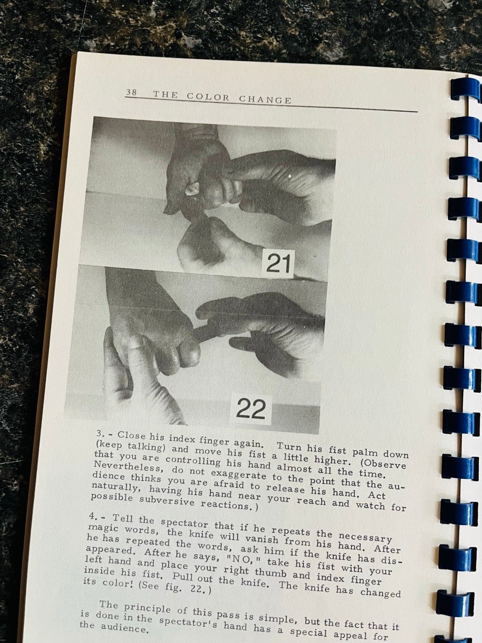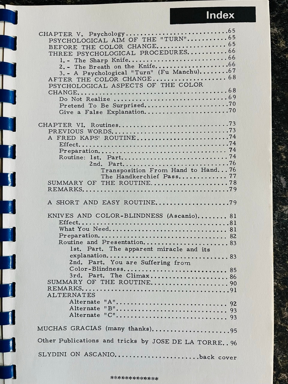 Techniques and routines include: Classic Paddle Move (Modernized), Cleaning Paddle Move, Passing The Knife From Hand To Hand, Appearance By The Pinkie, Turn With The Ring Finger, Ultra Fast Turn, Classic Color Change, Ascanio's Half Turn, Bringas' Color Change, Ganson's Color Change In A Spectator's Hand, One Hand Color Change, Color Change With Normal Knives, Manipulating The Knife As A Cigarette, Push-Through Palm, Two Fu Manchu Passes, Stealing With A Pull, Change Of Normal Knife To A Gimmicked One, Ascanio's Fast Change, To Tell The Sides Of The Knife By Touch, A Knives Classifier, Three Psychological Procedures, Psychological Aspects Of The Color Change, A Fred Kaps Routine, The Handkerchief Pass, A Short And Easy Routine, Ascanio's Knives And Color-Blindness and much more.