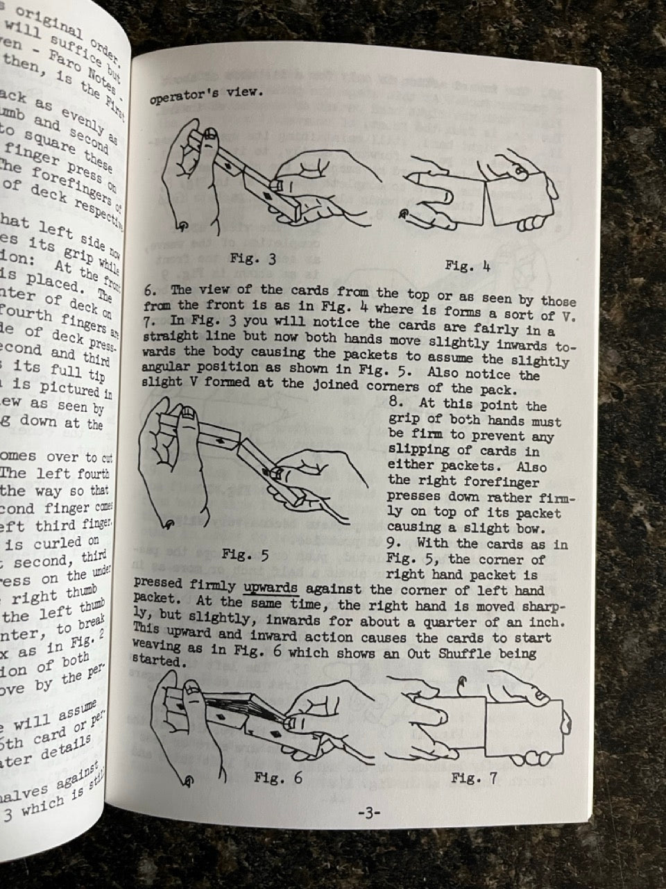 This booklet describes Marlo's techniques for the Faro Shuffle. This includes The First Technique, Faro Riffle Shuffle, and The Butt Shuffle. It also includes many Faro Aids, such as the Fourth Finger Table and the Rock and Reweave. It also contains more complex variations, like the Off Center Faro, Above Crimp Faro, and 26th Card Faro Check. 72 illustrations.