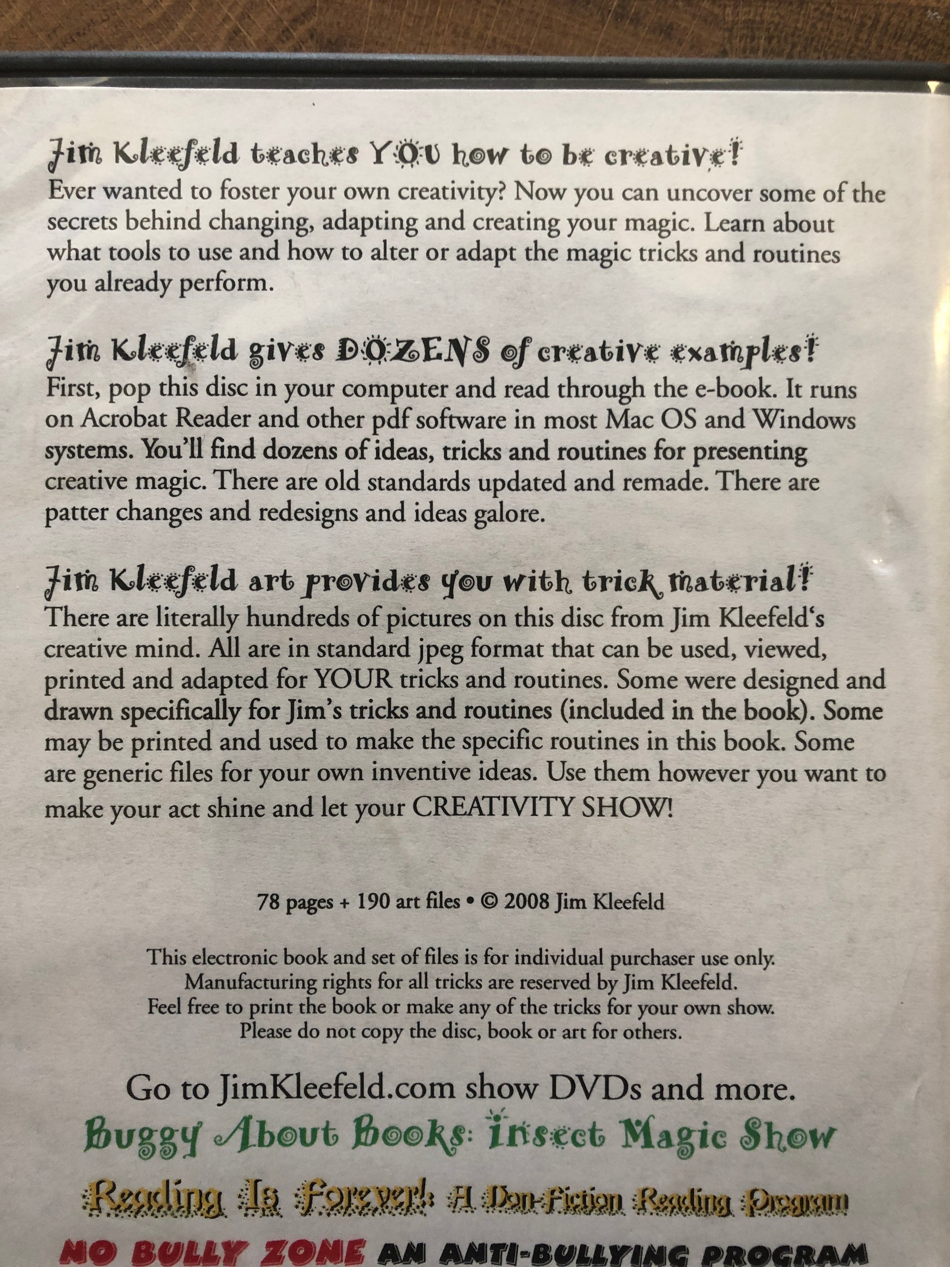 Jim's brand new book,Creativity Shows! is chock full of exciting new ideas on how to make your show more creative. Chapters on developing creativity and working with props begin the exploration. Learn how to change tricks by changing the patter, by embellishing and by redesigning. Following that are sections on creativity methods and tools with several suggestions and ideas that will save you immeasurable time and money. The bulk of the book includes tried and tested tricks and routines from Jim's immense repertoire. Well illustrated in full color are many projects, designs and tricks with full explanations and routining.