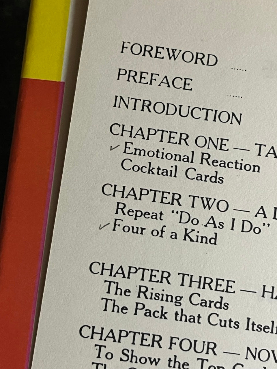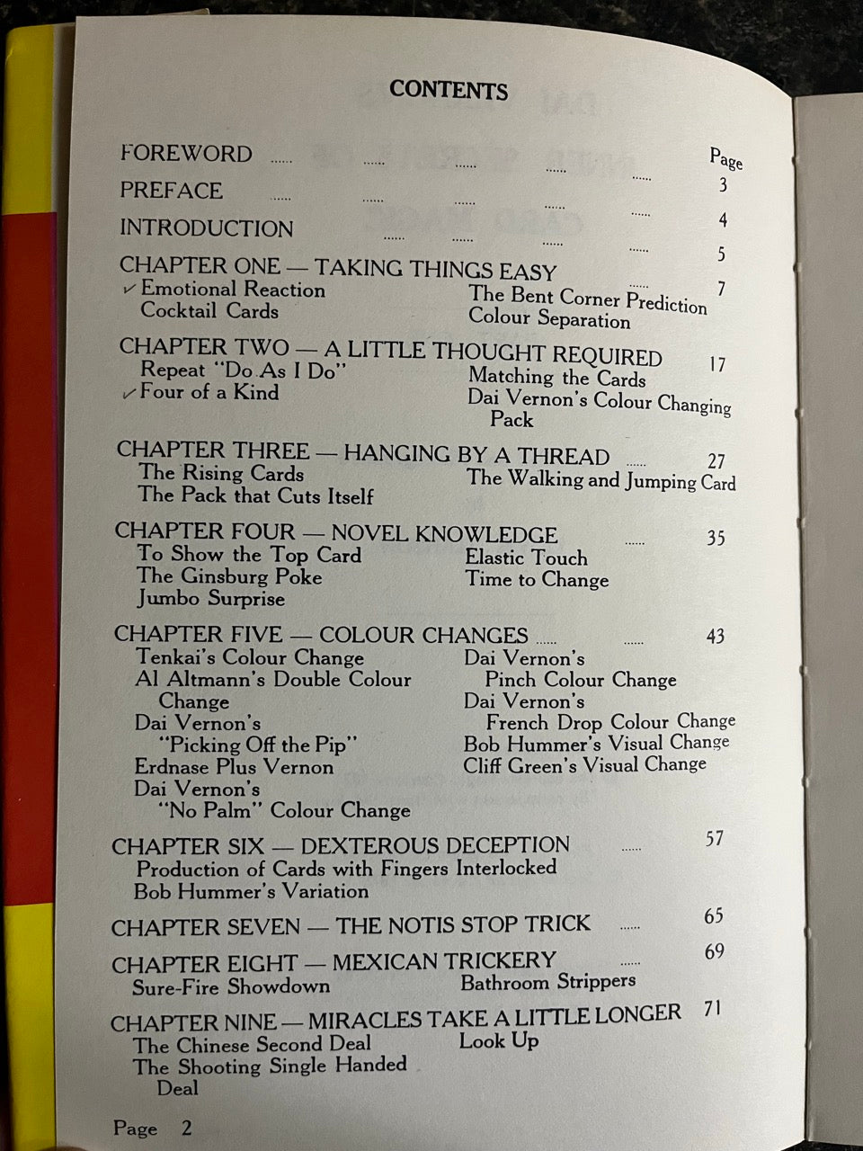 1) Inner Secrets of Card Magic. Black Hardcover, Yellow/Orange dust jacket, 76 pages, Supreme Magic.