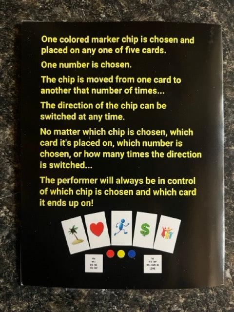 Then, one of two messages is revealed that reveals the performer controlled the choice of the color of the chosen chip. A number is now chosen. It can truly be any number. The chip is moved from one card to another that number of times. The participant can switch the direction of the chip at any time.