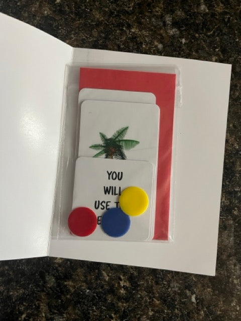 Here's what happens: One colored marker chip is chosen (red, yellow, or blue) and placed on any one of five cards which represent the topics of concerns that people make decisions on every day: Travel, Love, Health, Money, and Family.