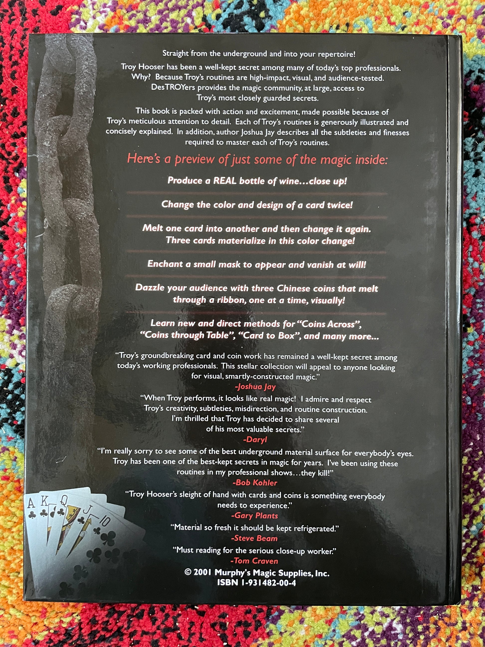 The name Troy Hooser has always been associated with the underground magic scene. For more than twenty-five years, Mr. Hooser has quietly developed a repertoire of material that amazes laymen. Hooser's material has also captured the imaginations of the magic industry's thought leaders-Troy Hooser is, perhaps, your favorite magician's favorite magician. In his first collection, he tips a lifetime of secrets and the theory behind them. These tricks wreak havoc on the logic of spectators. These tricks are Destroyers.
