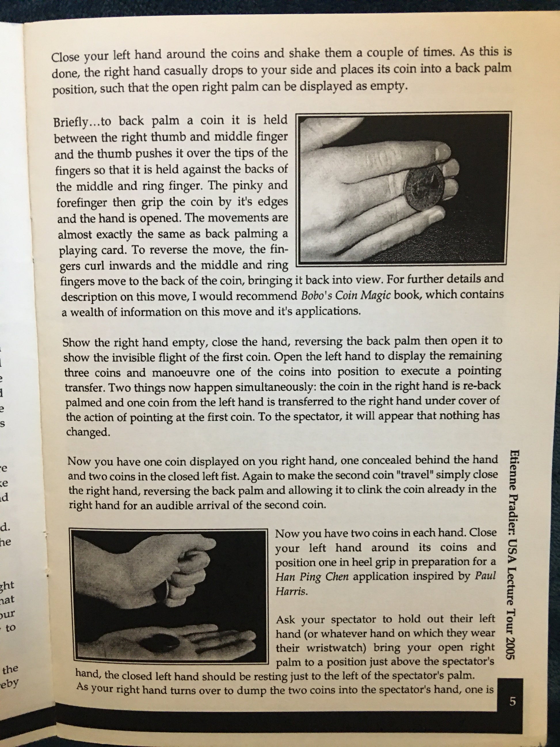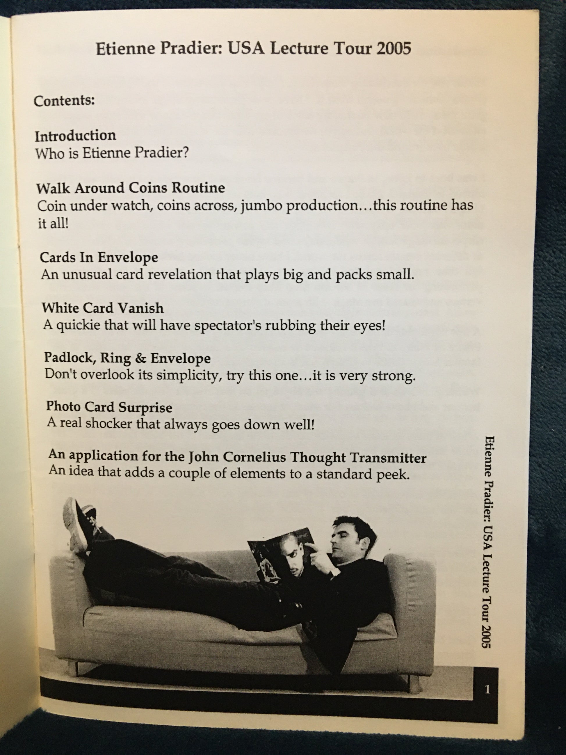 Lecture tour 2005 contains: Introduction, Walk around coins routine, Cards in envelope, White card vanish, Padlock, ring and envelope, Photo card surprise, and an application for the John Cornelius Thought Transmitter