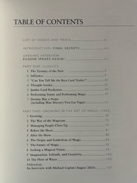 Focused entirely on the masterful card magic that made Eugene a close-up star, FINAL SECRETS collects essays, interviews, and complete descriptions of seventeen real-world card routines that Eugene didn't share in any book-including Influence, Fishing, Order and Chaos, Thought Sender, and his legendary work on The Trick that Cannot Be Explained.