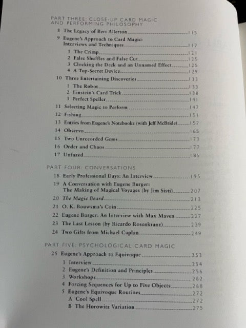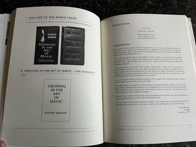 EUGENE BURGER: FINAL SECRETS also includes both the text and audio versions of Eugene's 1992 masterpiece, Growing in the Art of Magic. Thus, the book provides access to twenty-seven videos and audio recordings of Eugene performing and explaining his wonderful card magic, and sharing his wisdom about reaching toward excellence in the art.