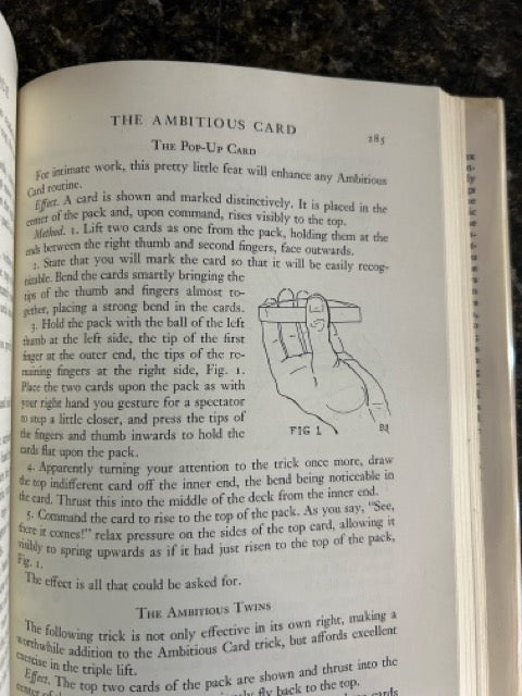 Table of contents is so extensive, including Lifts, deals, flips, the pass, palming, False Shuffles, false cuts, changes, crimps, glimpses, peeks, jogs, reversals, controls, turnovers, faro shuffle, flourishes, rising cards, gambling tricks, assemblies, ambitious card, double & triple lifts, card discoveries, mental discoveries, spelling tricks, double faced cards, stranger cards, self-working tricks, card splitting, Svengali, misdirection, presentation, and much, much more.