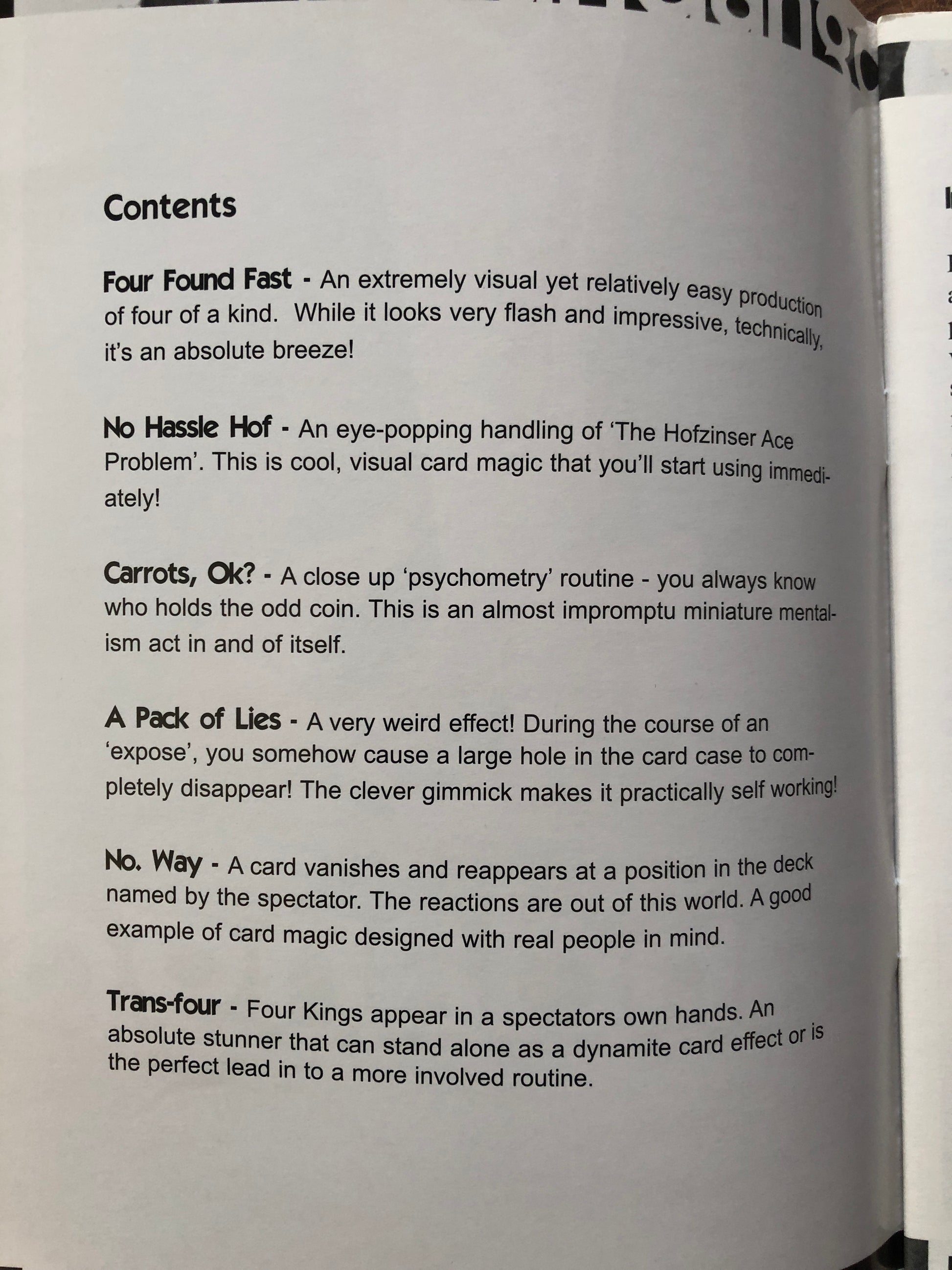 A Pack of Lies - A very weird effect! During the course of an 'expose', you somehow cause a large hole in the card case to completely disappear! The clever gimmick makes it practically self working!
