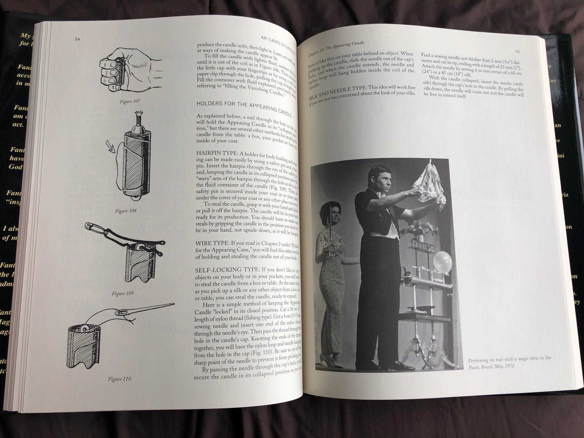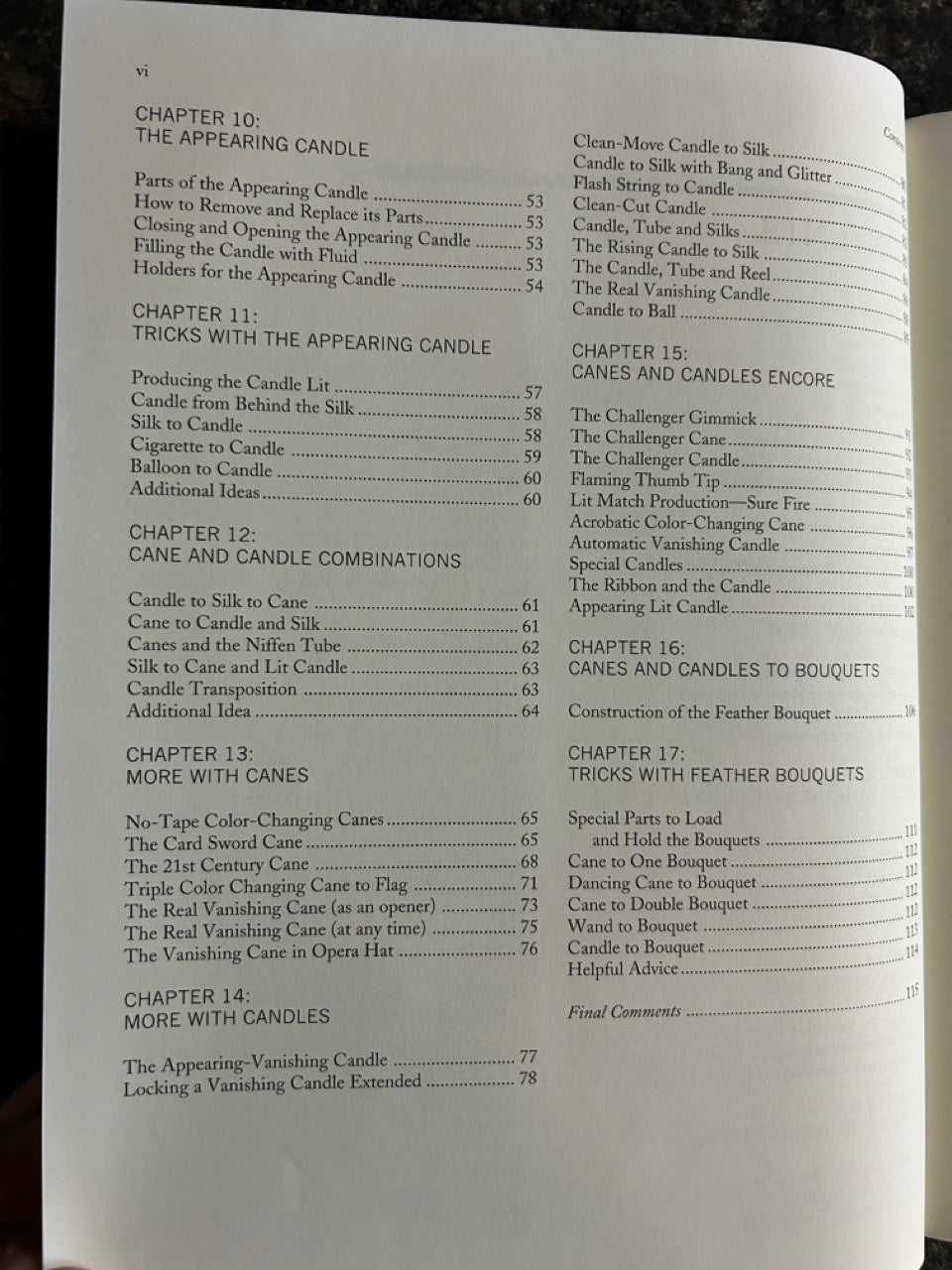 Contents include: The Fantasio Canes and Candles; The Appearing Cane; Tricks with the Appearing Cane; The Vanishing Cane; Tricks with the Vanishing Cane; The Vanishing Wand; Tricks with the Vanishing Wand; The Appearing Candle; Tricks with the Appearing Candle; Cane and Candle Combinations; More with Canes; More with Candles; Canes and Candles Encore; Canes and Candles to Bouquets; Tricks with Feather Bouquets and more!