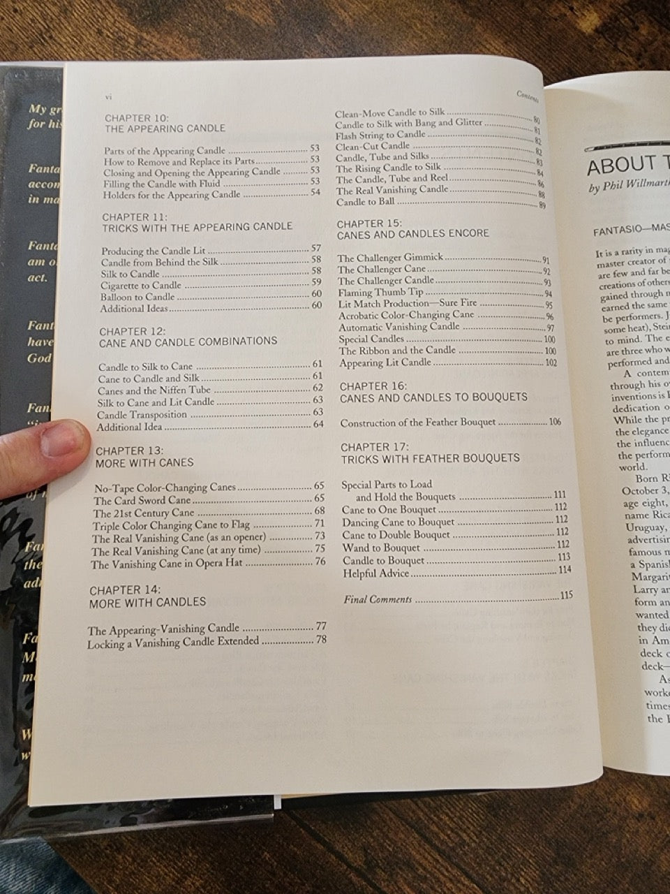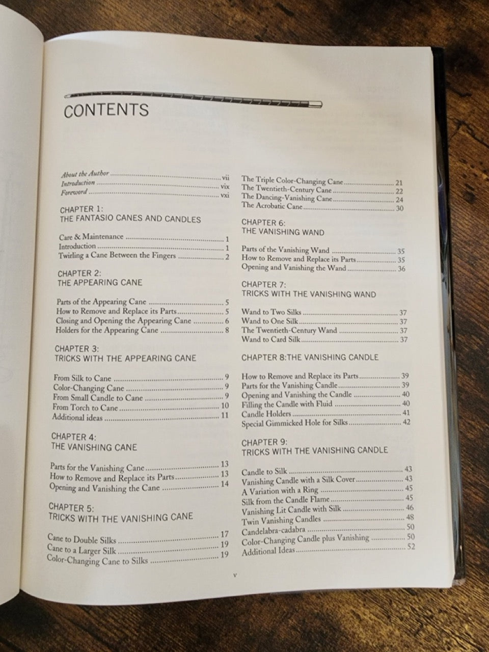 Contents include: The Fantasio Canes and Candles; The Appearing Cane; Tricks with the Appearing Cane; The Vanishing Cane; Tricks with the Vanishing Cane; The Vanishing Wand; Tricks with the Vanishing Wand; The Appearing Candle; Tricks with the Appearing Candle; Cane and Candle Combinations; More with Canes; More with Candles; Canes and Candles Encore; Canes and Candles to Bouquets; Tricks with Feather Bouquets and more!