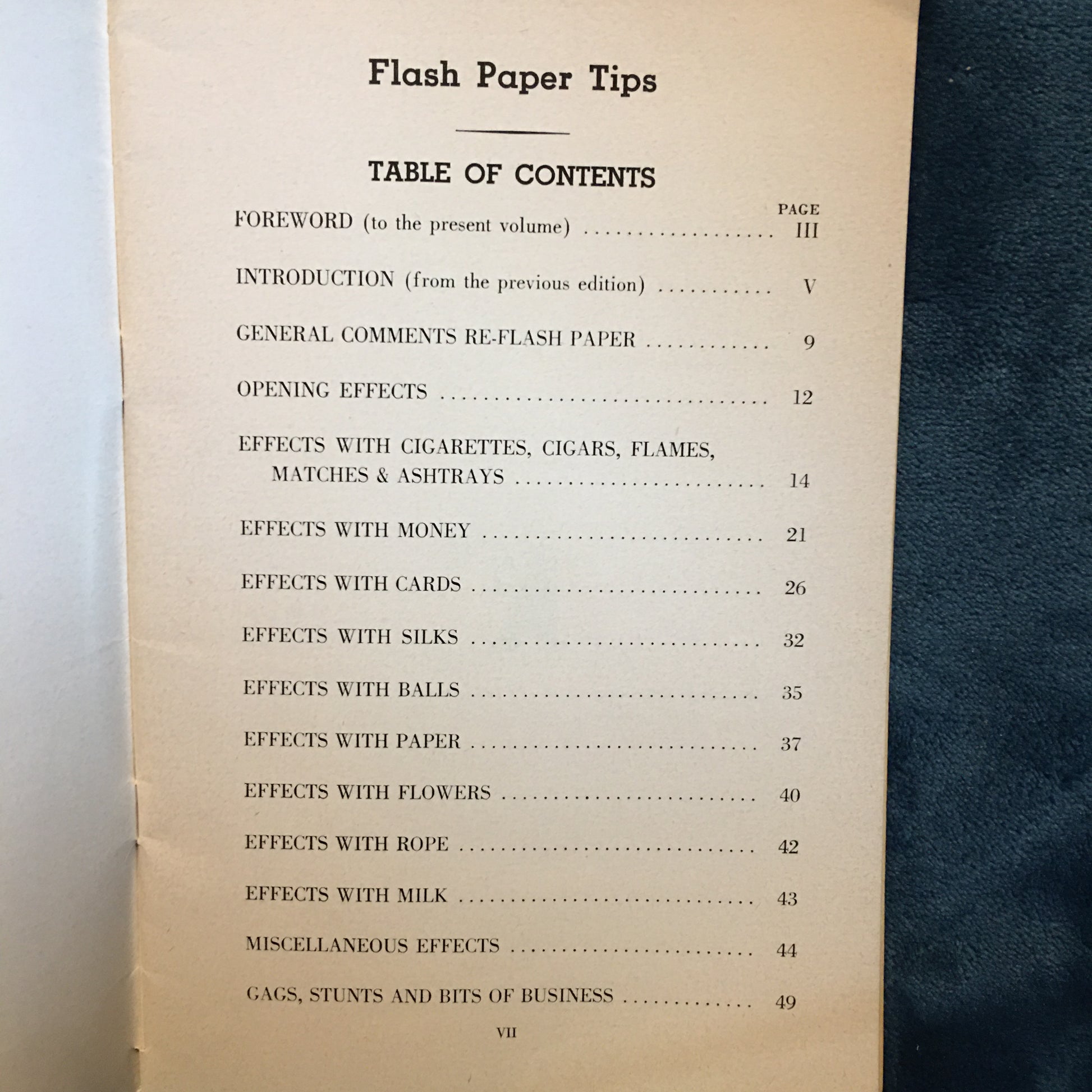Tricks and gags with flash paper are becoming more and more popular. Once you have used flash paper or flash bills in a trick you will understand why. The unexpected flash of flame, not matter how it is used, adds a dramatic touch or "punch" to any trick or gag. In this revised book you have 56 pages of flash paper tips.