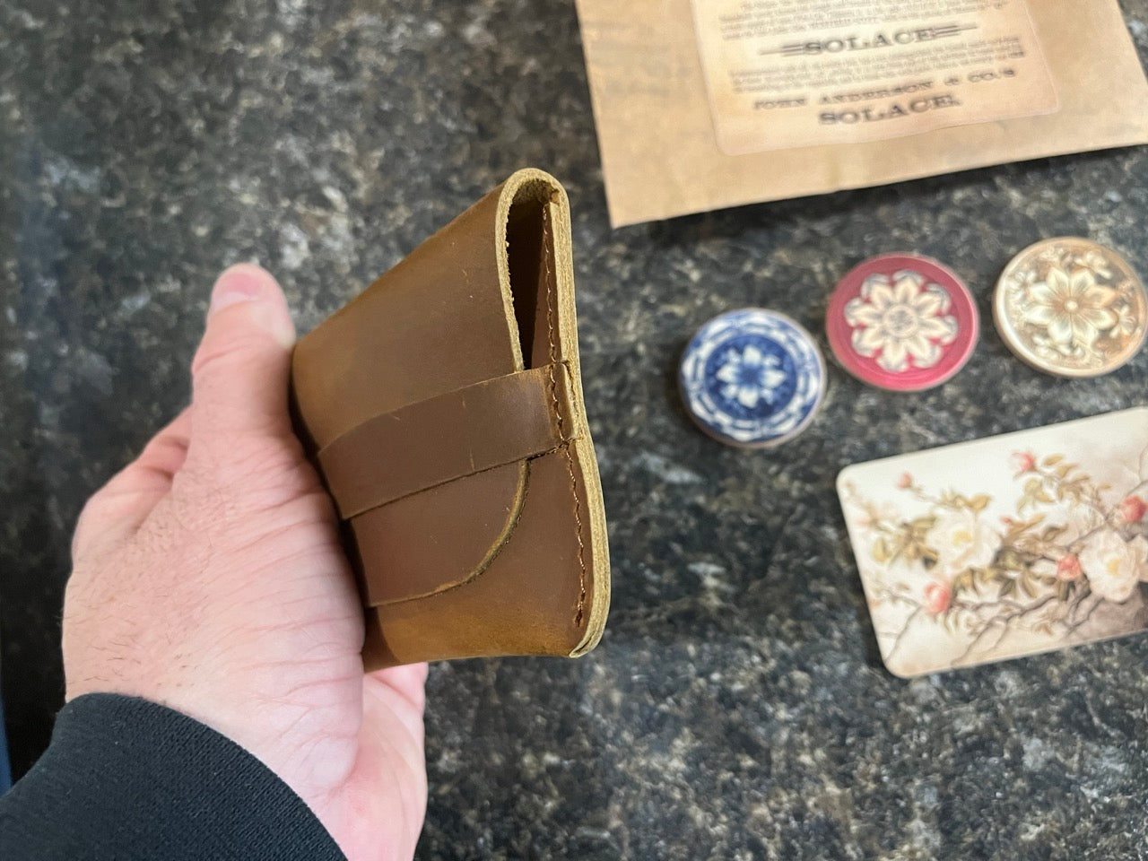 And, as always with the Dead Rebel Productions, the props are second to none. The chips are custom printed in full color, the leather wallet looks gorgeous (and will only look better with age) and the whole thing comes wrapped in a faux tobacco packaging. Even the prediction card looks amazing!