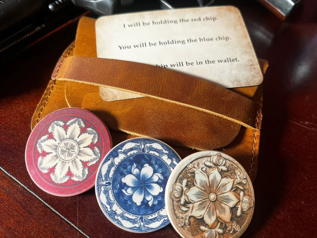 Finally, you have them mix the chips again, and have them keep one, give one to you, and put one in the wallet. Astonishingly, a prediction that was left in full view reveals the location of ALL THREE CHIPS!