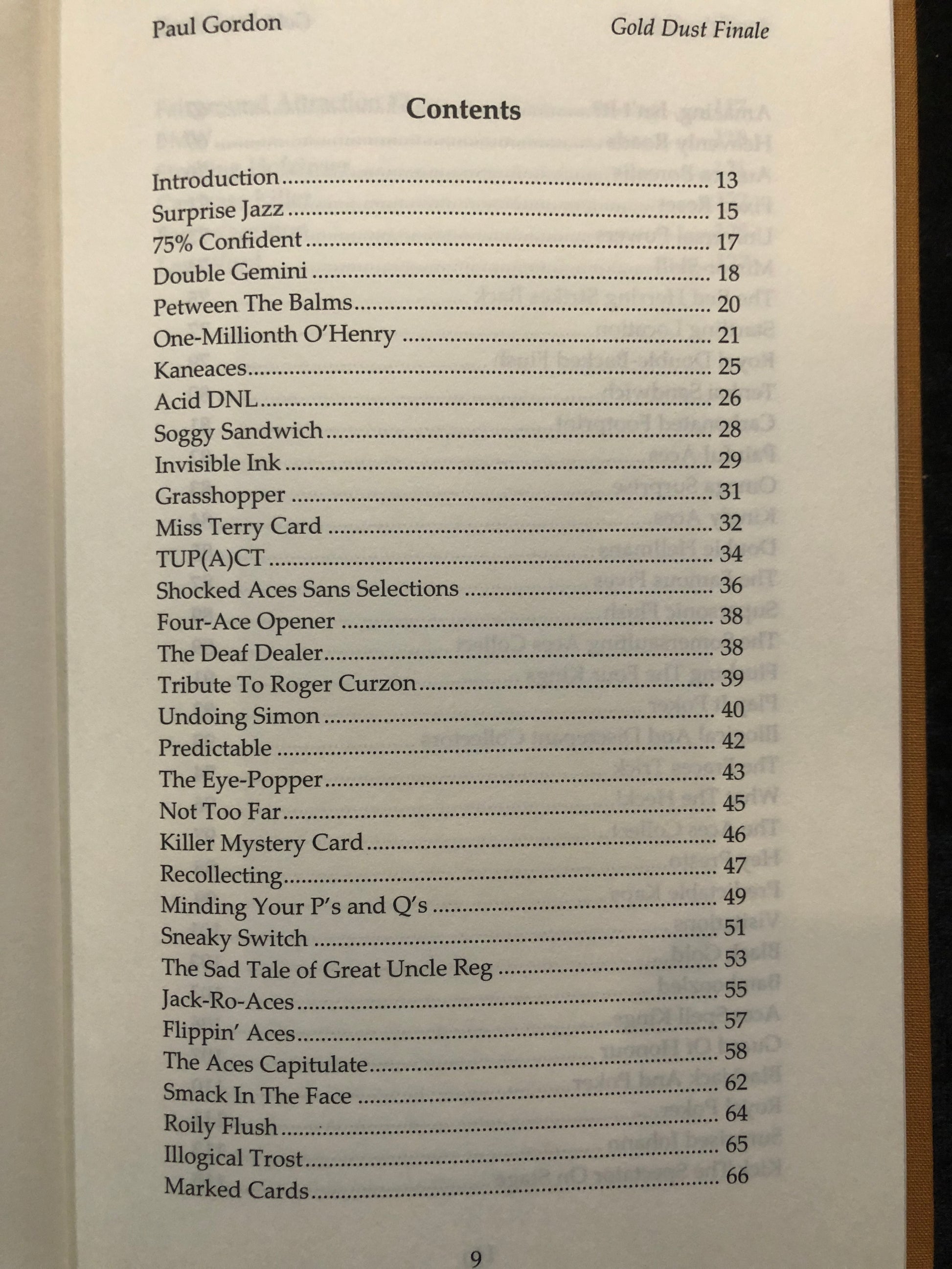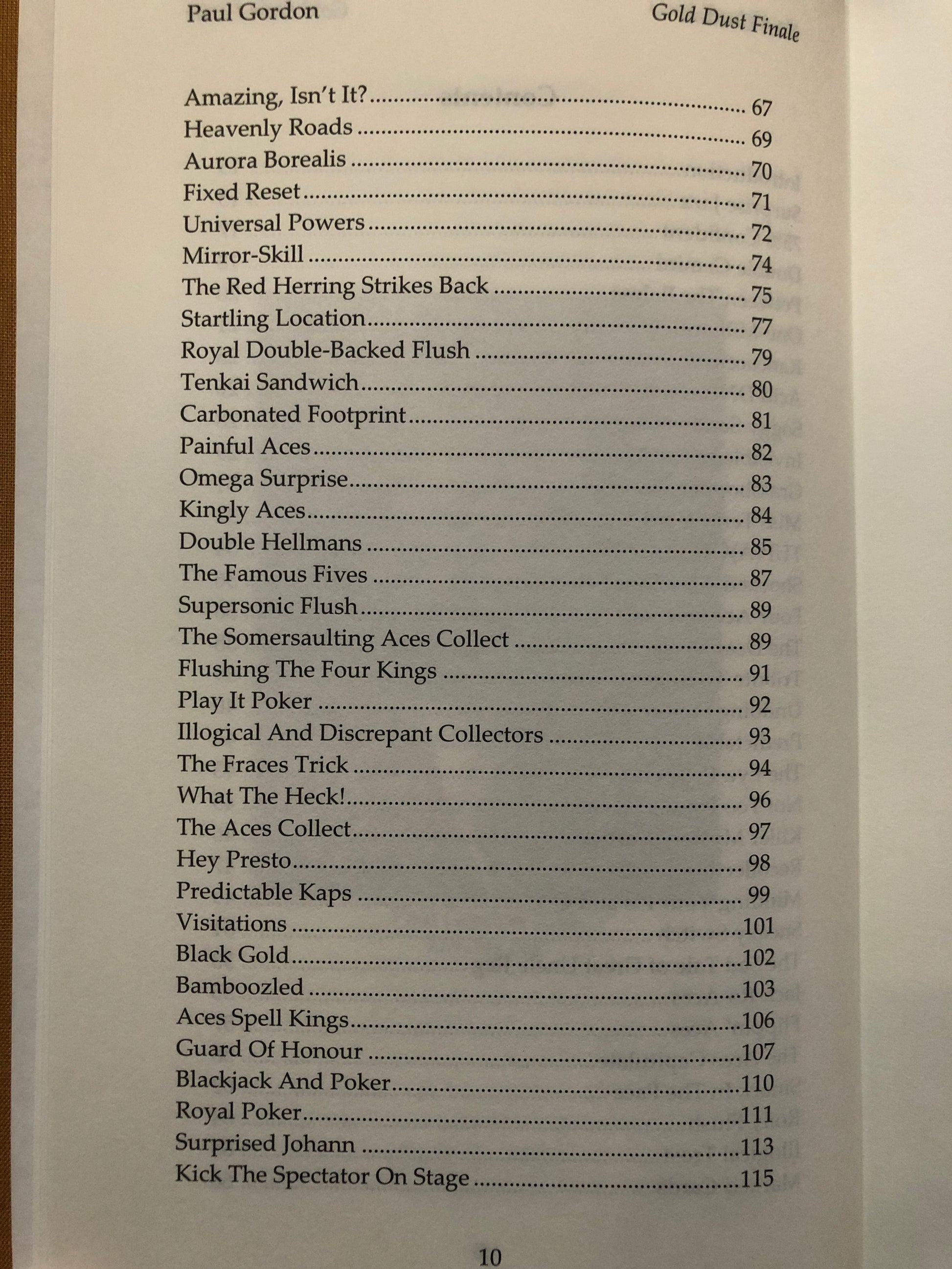 This final volume of the best-selling Gold Dust Trilogy contains 63 NEW tricks (as of 2015). Each and every trick is powerful and magical. 128 pages. Top-quality saddle-stitched cloth-covered hardback. Gold Dust Finale contains some real gems. It's been said (on The Magic Cafe) that Killer Mystery Card, Tenkai Sandwich and Kane Aces are worth the price of the book on their own! Paul's writing is very easy to understand, too. And, most tricks are described in just one or two pages!