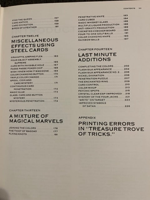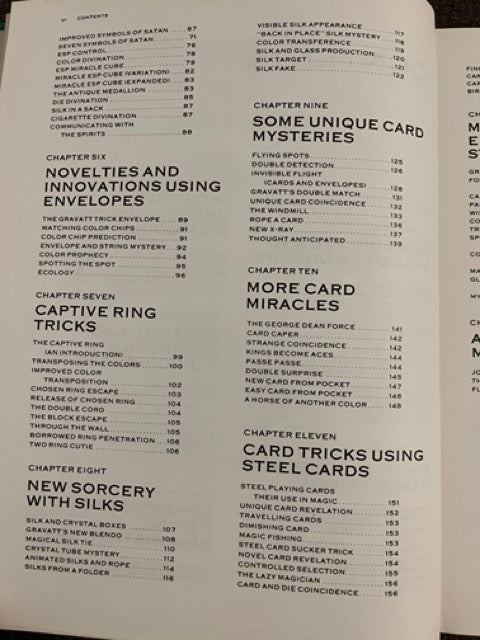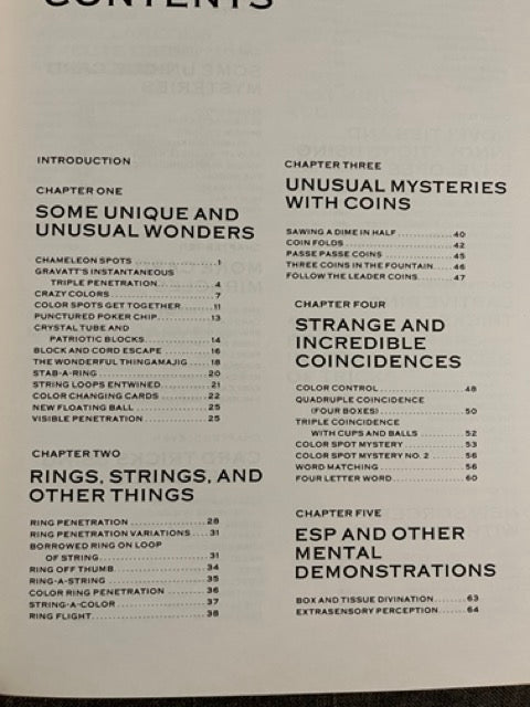 Chapters include 13 Unique & Unusual Wonders, 8 Rings Strings & Other Things, 5 Unique Coin Mysteries, 7 Strange Coincidences, 14 ESP & Mental Effects, 7 Envelope Effects, 10 Ring Tricks, 12 Silk Effects, 9 Unique Card Mysteries, 9 More Card Miracles, 14 Effects with Steel Cards, 12 More Miscellaneous Effects Using Steel Cards, 12 Miscellaneous Marvels, and 13 Last Minute Additions.