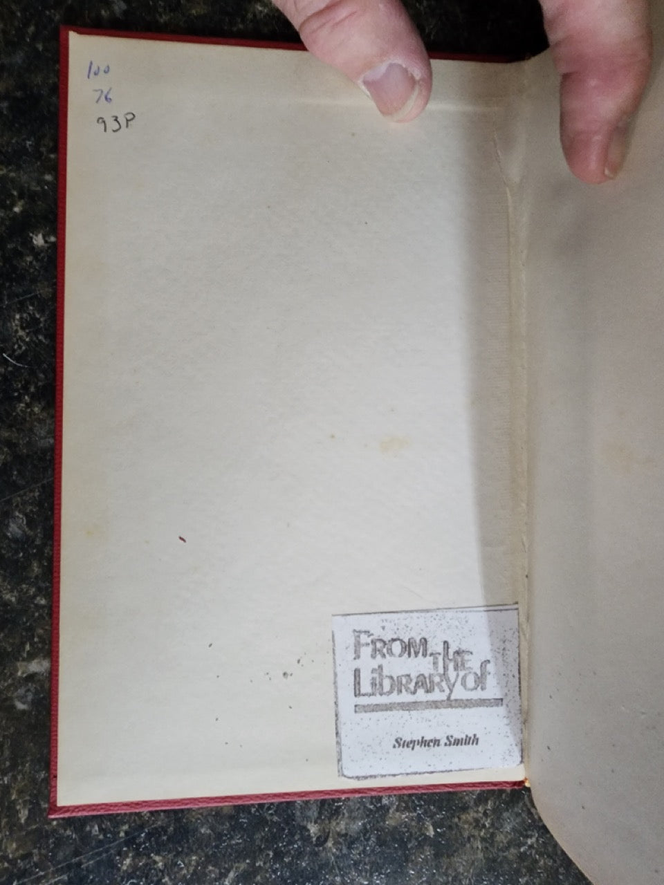 Copy #2 -USED, hardcover, 92 pages. It appears that the spine has come loose at one time, and has been glued back on. Former owner pasted his nameplate inside book, and also a colored dot on front cover or spine, by which he indexed his collection.