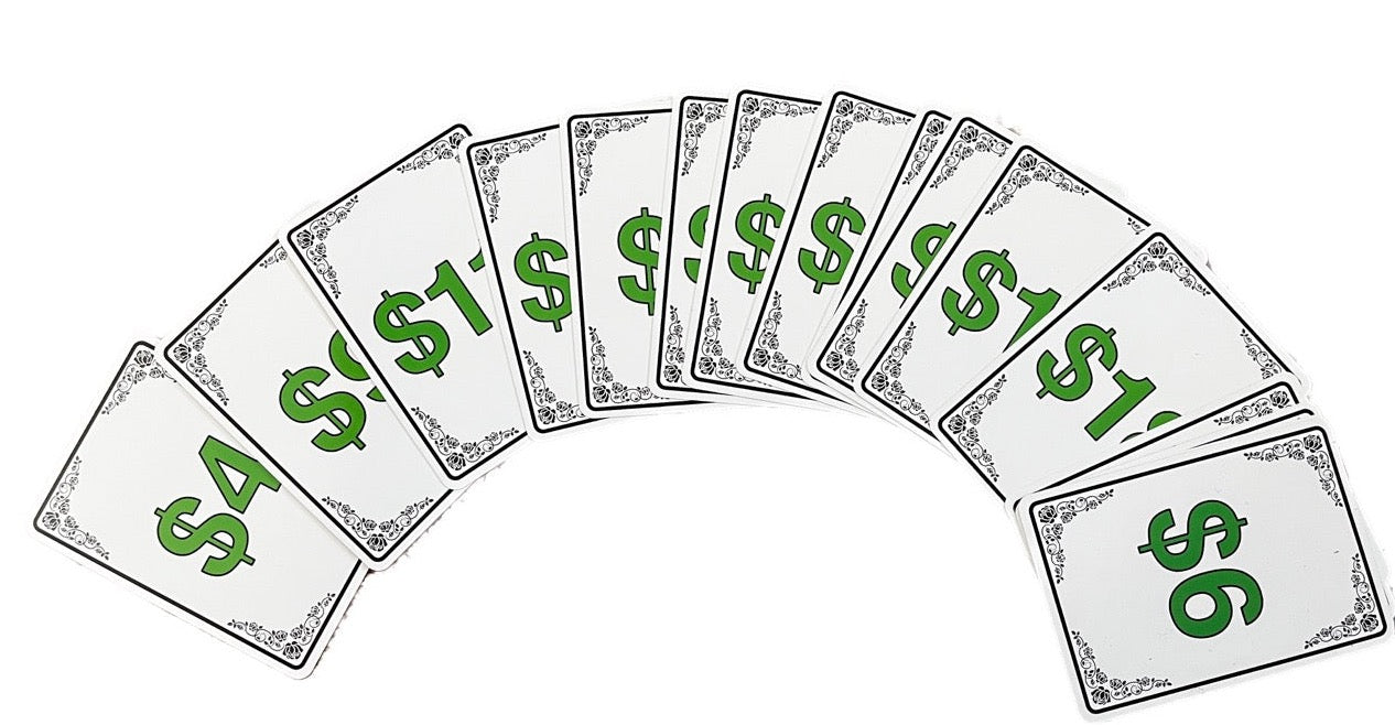 A collection of cards with different drinks, appetizers, entrees and desserts from a variety of restaurants are introduced. Using these like a big menu, your participant orders a four course meal. The cards are then turned over to reveal prices on the backs. Each item has a different value. When the prices of their selections are added together, the total amount perfectly matches your prediction!