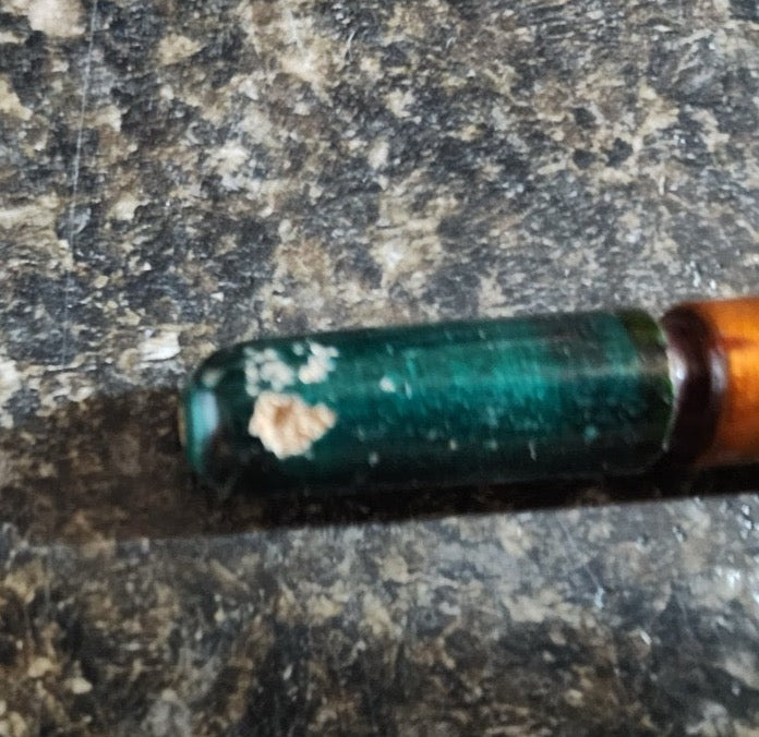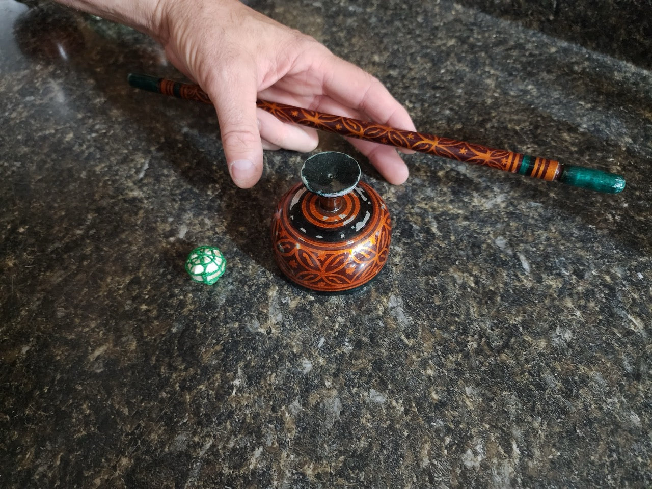 For use in the classic Indian Cups and Balls routine, this is a green, brown, and orange hand-painted wand with a satiny sheen to the finish. A few light chips to the paint from use, else very good. Plus, a set of three beautifully hand painted Indian-style cups, with deep green, brown, and metallic orange on the exterior and matte purple inside.