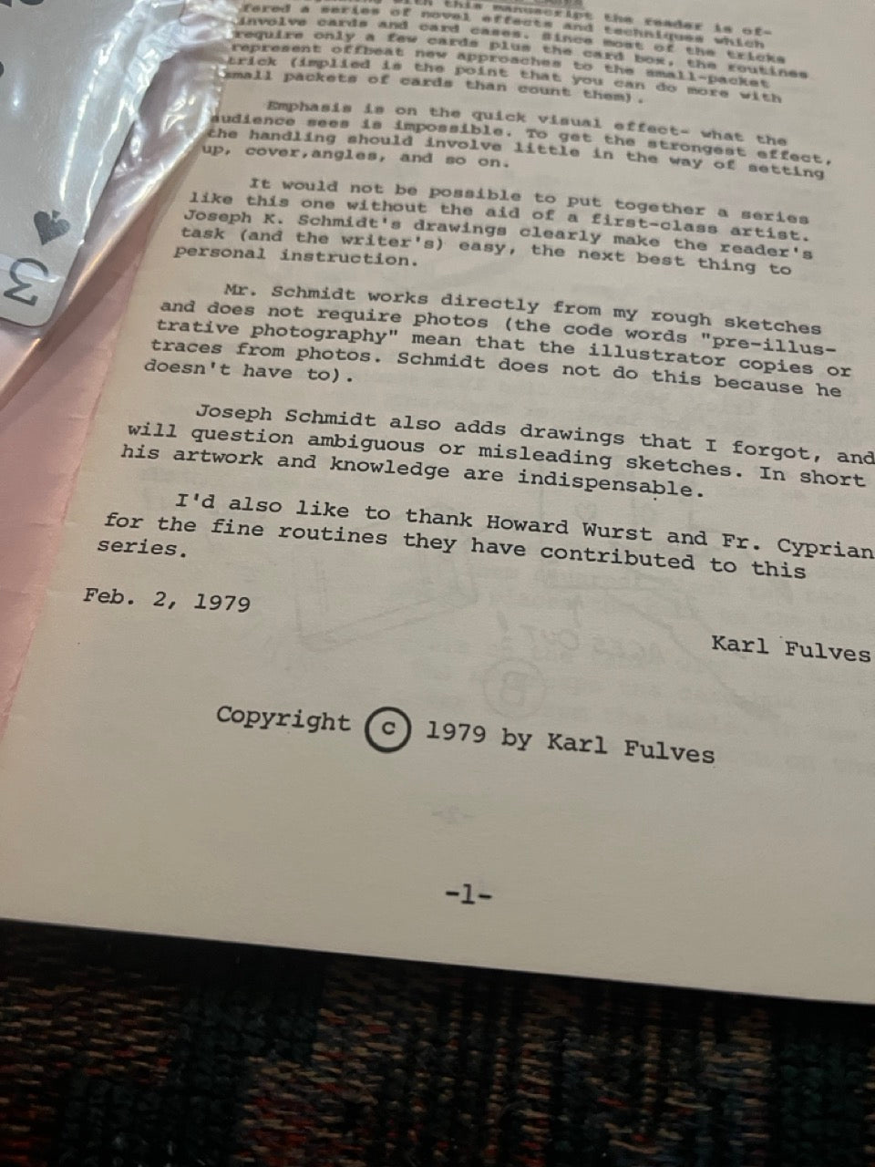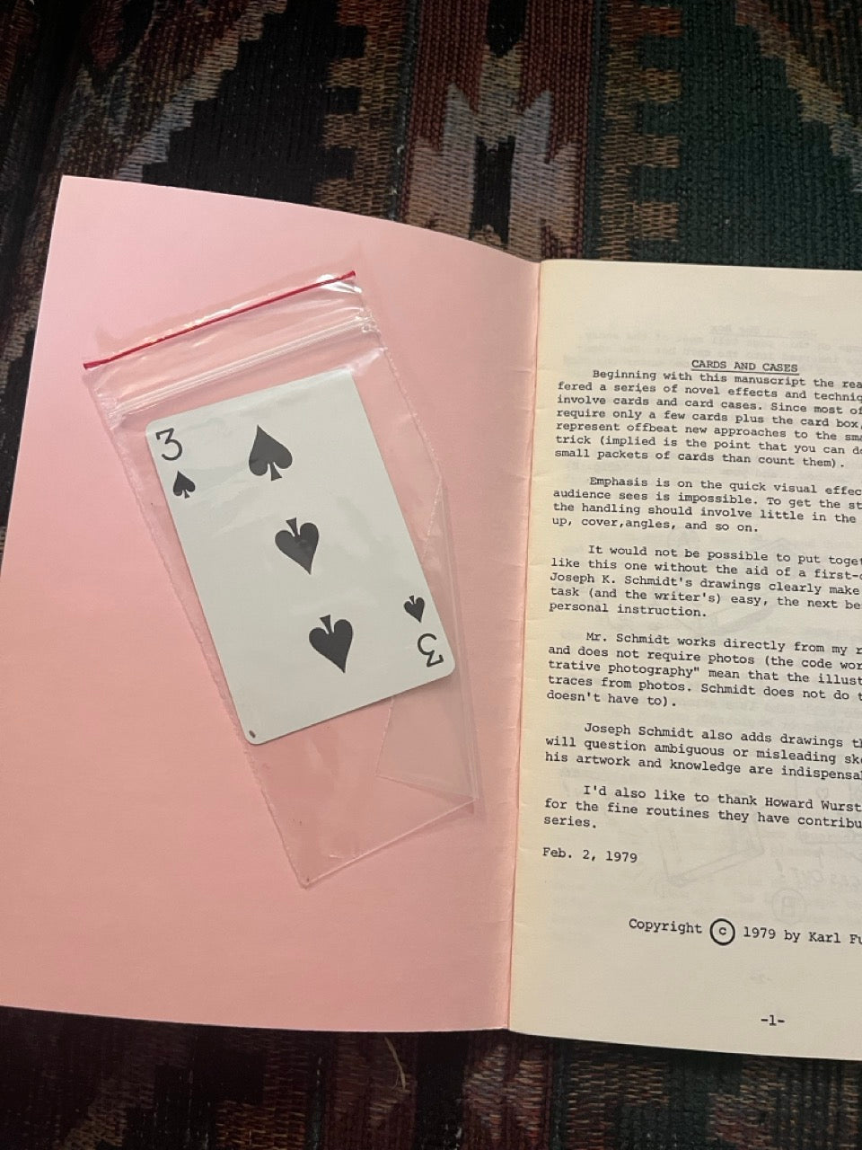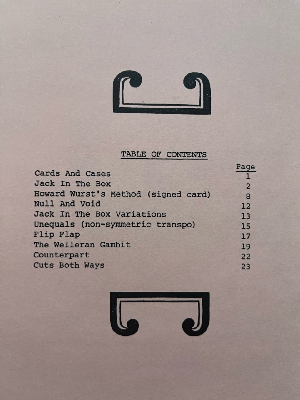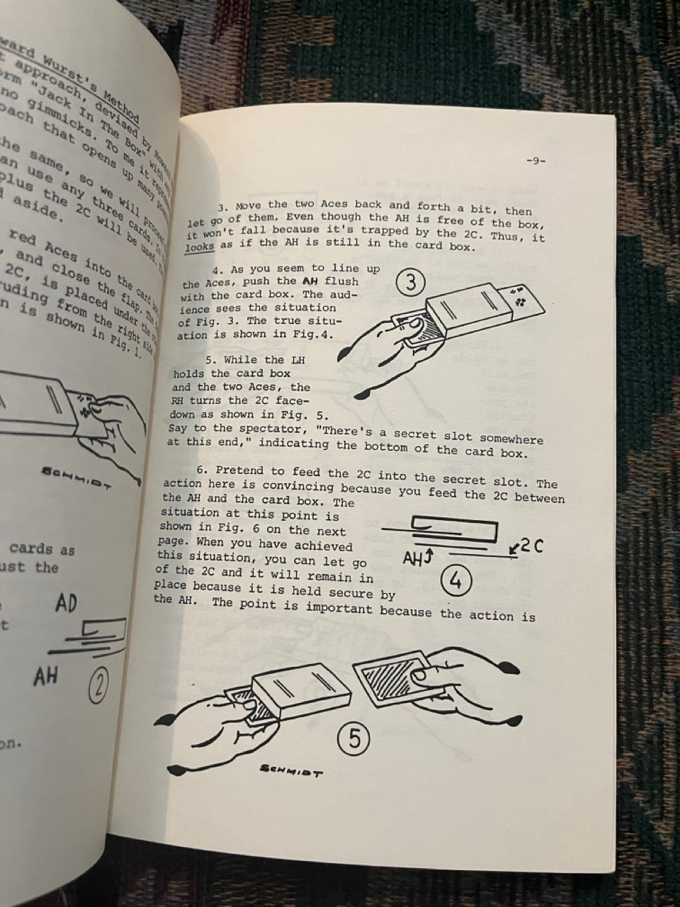 The introduction in part reads: "Beginning with this manuscript the reader is offered a series of novel effects and techniques which involved cards and card cases. Since most of the tricks require only a few cards plus the card box, the routines represent offbeat new approaches to the small-packet trick (implied is the point that you can do more with small packets of cards then count them). Emphasis on the quick visual effect – what the audience sees is impossible. To get the strongest effect, the handling should involve little in the way of setting up, cover, angles, and so on. It would not be possible to put together a series like this one without the aid of a first-class artist. Joseph K. Schmidt’s drawings clearly make the reader’s task (and the writer’s) easy, the next best thing to personal instruction."