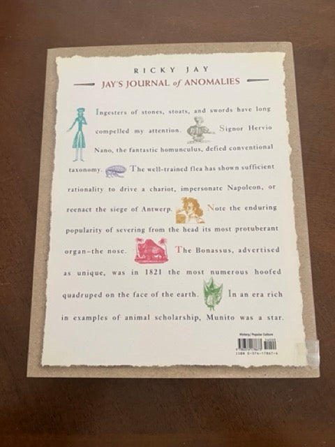 For the past four years, the multitalented Ricky Jay (sleight-of-hand artist, author, actor, film consultant, and scholar of the unusual) has published a unique and beautifully designed quarterly called Jay's Journal of Anomalies. Already a coveted collector's item, the complete set is gathered here for the first time. A brilliant excursion into the history of bizarre entertainments, the journal covered such subjects as dogs stealing acts from other dogs, an anthropological hoax involving the only survivors of a caste of ancient Aztec priests, and the ultimate diet: ingesting only air.In a delectably deadpan and winning style, Jay conveys his admiration and affection for the offbeat that characterized his bestselling Learned Pigs and Fireproof Women. He explains how wags since the sixteenth century have cheated at bowling; he explores the ancient relationship between conjuring and dentistry; and he chronicles the exploits of ceiling walkers and human flies. Crammed full of illustrations drawn from the author's massive personal archive, Jay's Journal of Anomalies will baffle, instruct, and, above all, delight.