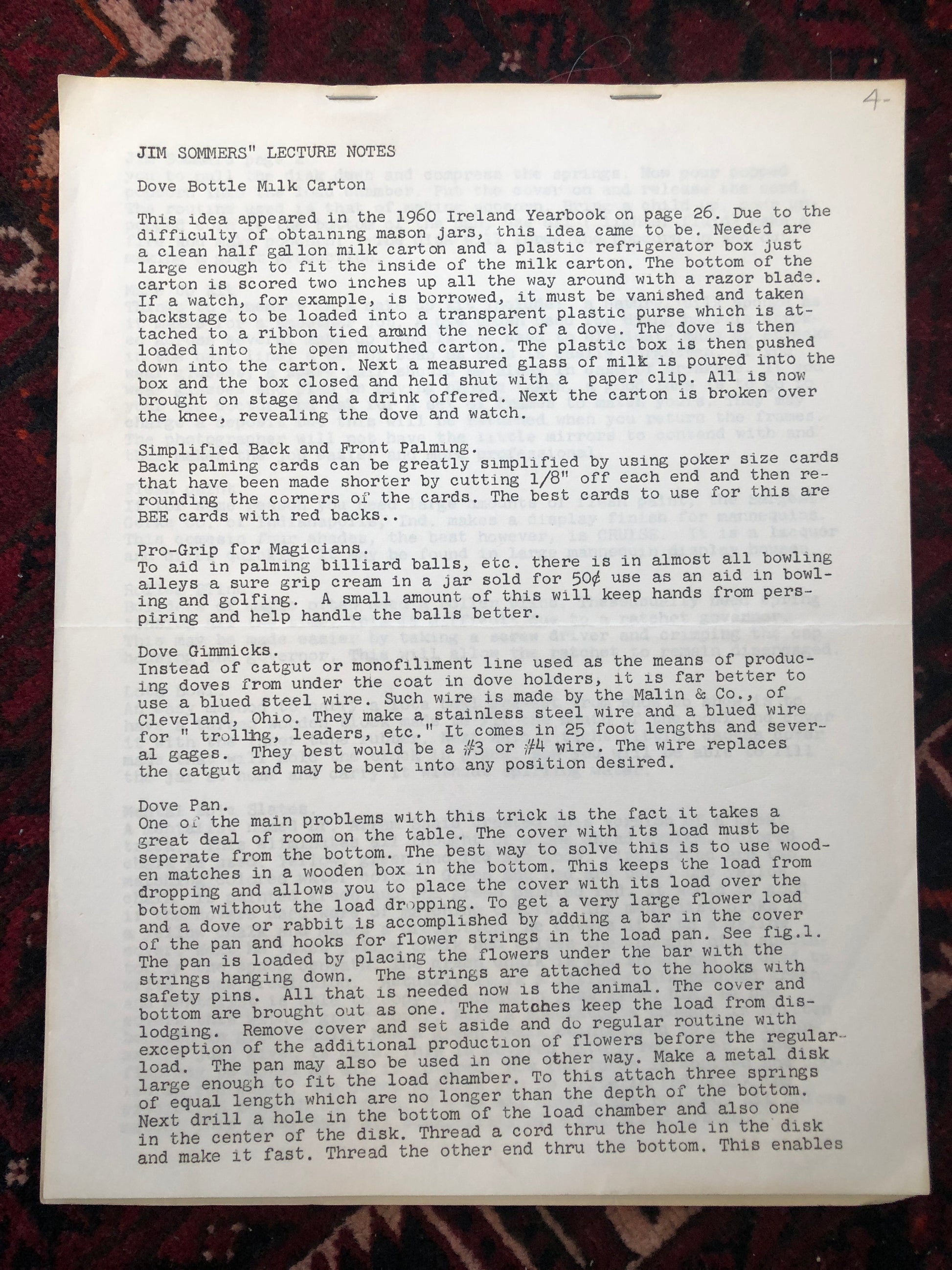 Covers Dove Bottle Milk Carton, Pro Grip for Magicians, Simplified front and back palming, dove gimmicks, dove pancake up kit, Lots Bowls, Mental Epic prop, and more.