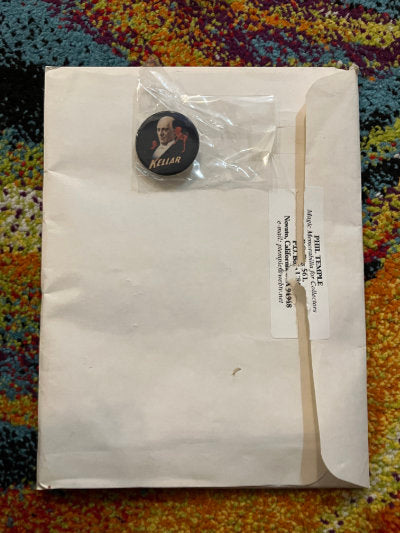 The button was created to compliment the Kellar Wonder Book, this 1.75" round finback button presents the famous Strobridge Kellar portrait, and is reminiscent of the finback buttons produced in later years by Kellar's successor, Howard Thurston.