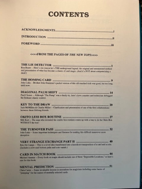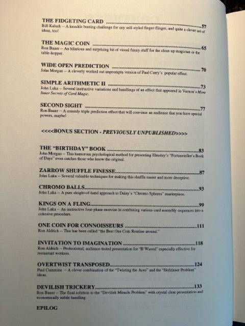 This effort was kicked off in Luka's "Thoughts On..." column which ran in The New Tops magazine from October, 1993 to December, 1994. John's column was for the majority of magicians who tend to do a lot of pocket and parlor tricks for small audiences and a few informal and sometimes spontaneous shows like at parties or at business get togethers. So he chose material for ninety-plus percent of magicians who are not professionals. You won't find any knuckle busters within this volume. But, you will find MANY things you can use.