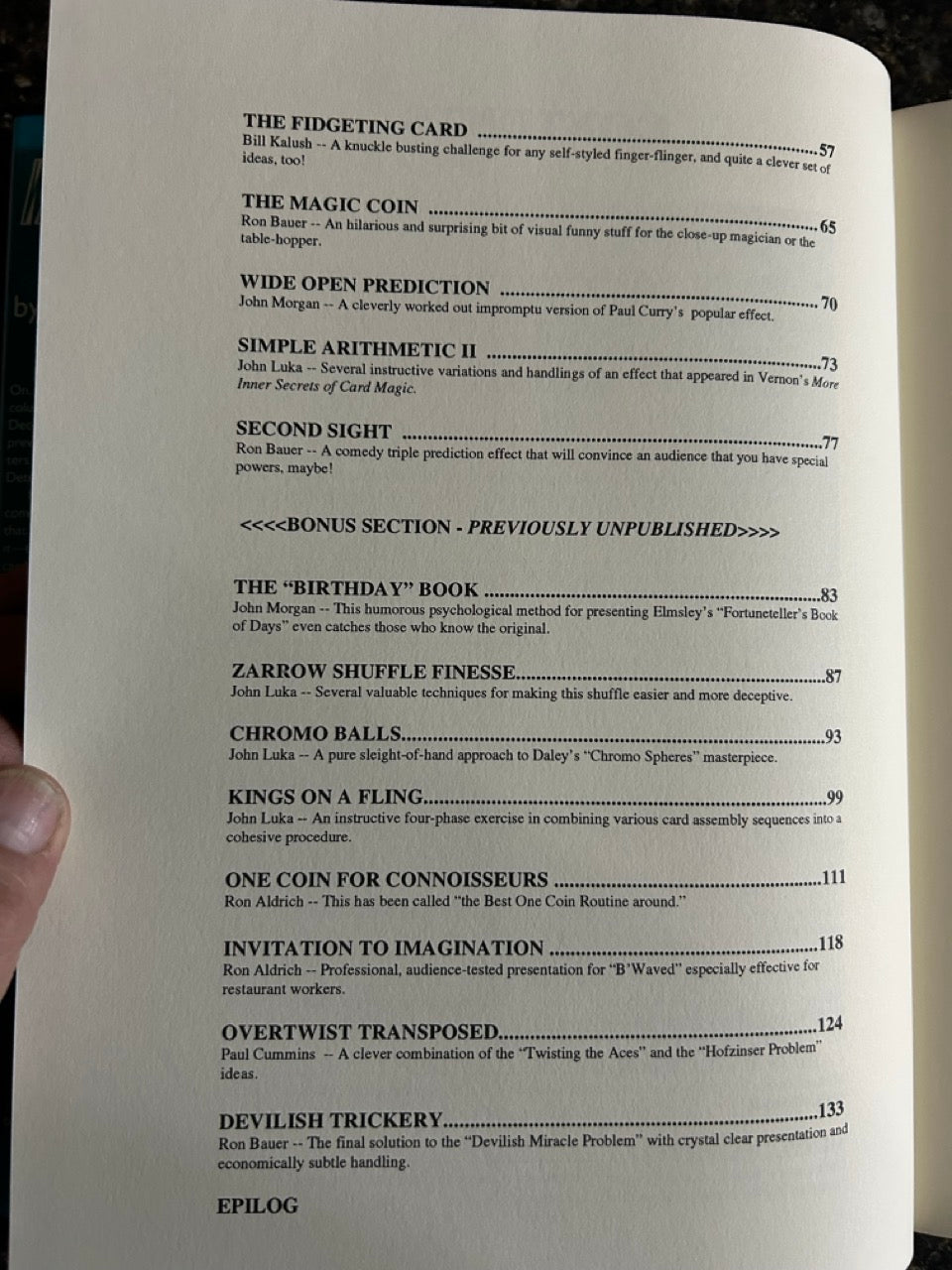 This effort was kicked off in Luka's "Thoughts On..." column which ran in The New Tops magazine from October, 1993 to December, 1994. John's column was for the majority of magicians who tend to do a lot of pocket and parlor tricks for small audiences and a few informal and sometimes spontaneous shows like at parties or at business get togethers. So he chose material for ninety-plus percent of magicians who are not professionals. You won't find any knuckle busters within this volume. But, you will find MANY things you can use.