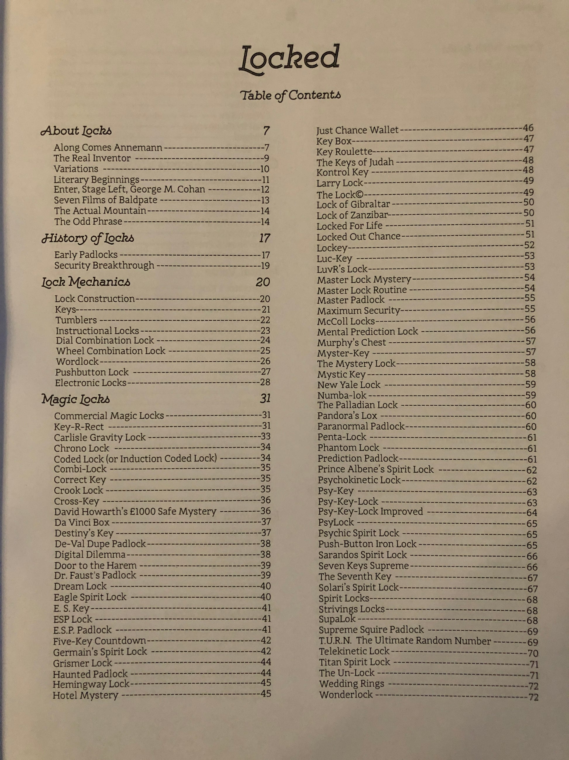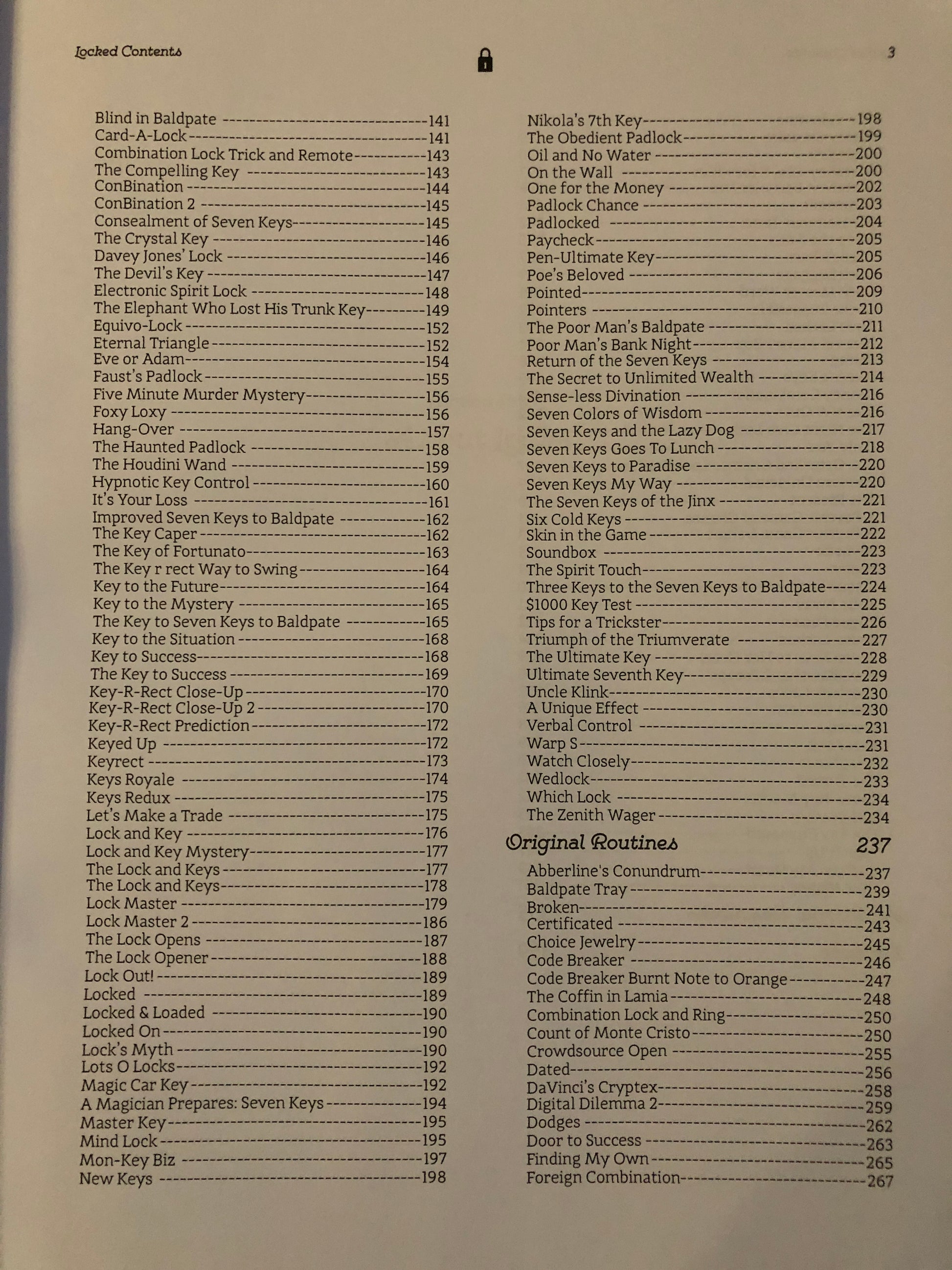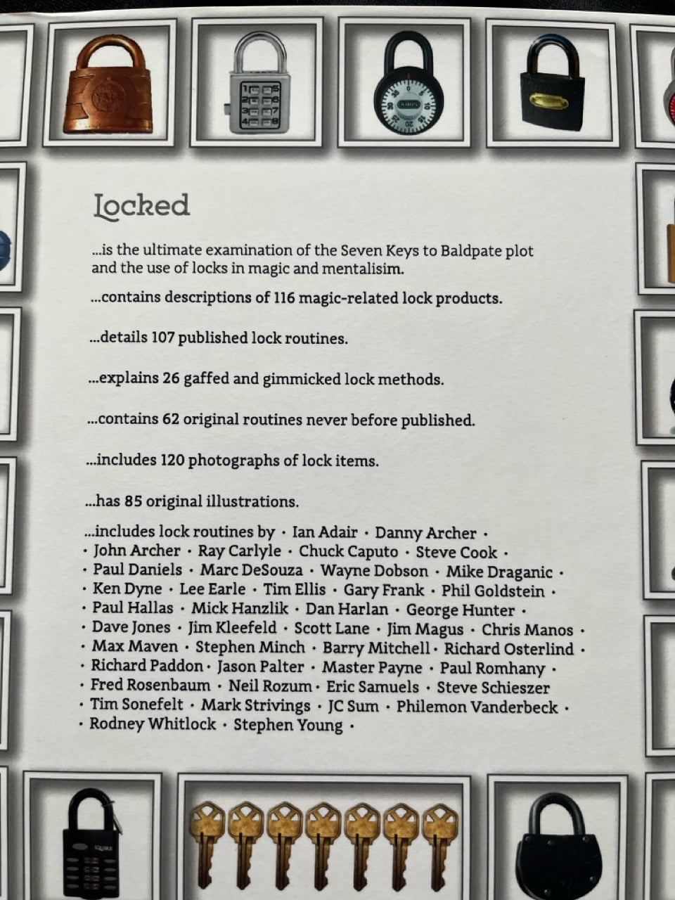 Locked is the biggest, best book in mentalism this year and one you will use and refer to over and over with dozens of routines that use padlocks, keys, combination locks, locked boxes, locked car doors, house keys and more. There are fully scripted routines that are serious, romantic, funny, bizarre, historical, dramatic, magical, mental, mysterious and outrageous. It has material suitable for stage, close-up, parlor, table-hopping, kidshows, and strolling. Locked is the book to get, read, savor, study and enjoy, now and for years to come.