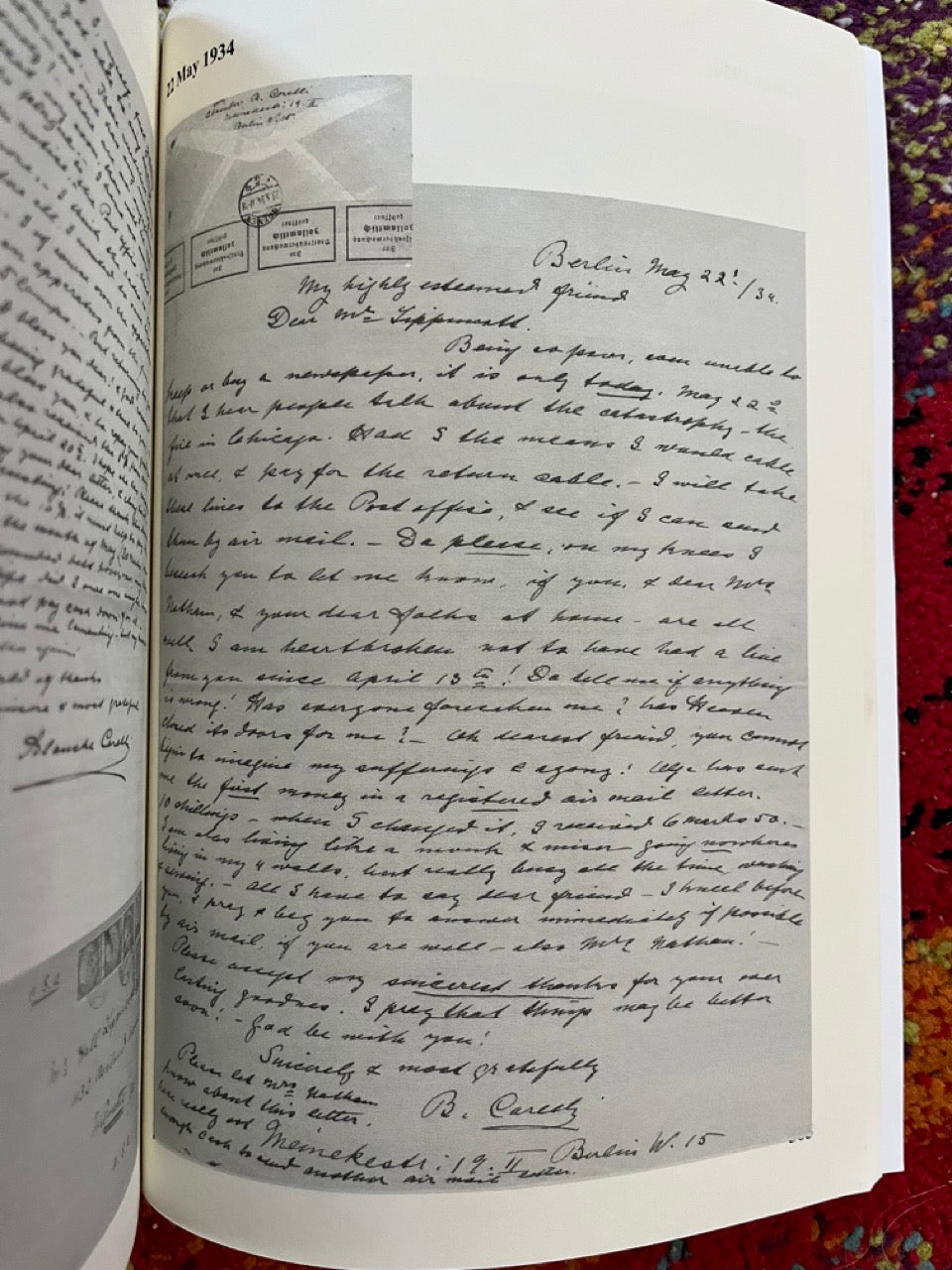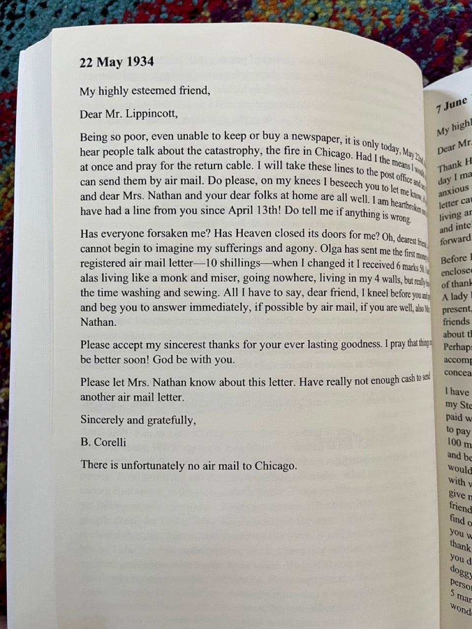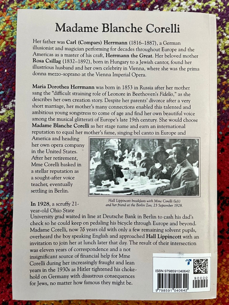 In 1928, a scruffy 21-year-old Ohio State University grad waited in line at Deutsche Bank in Berlin to cash his dad’s modest check so he could keep on pedaling his bicycle through Europe and beyond. Madame Corelli, now 75 years old with few remaining solvent pupils, overheard the boy speaking English and approached Hall Lippincott with an invitation to join her at lunch later that day. The result of their chance meeting was eleven years of correspondence and a not insignificant source of financial help for Madame Corelli during her increasingly fraught and lean years in the 1930s as Hitler tightened his chokehold on Germany with disastrous consequences for Jews, no matter how famous they might be.