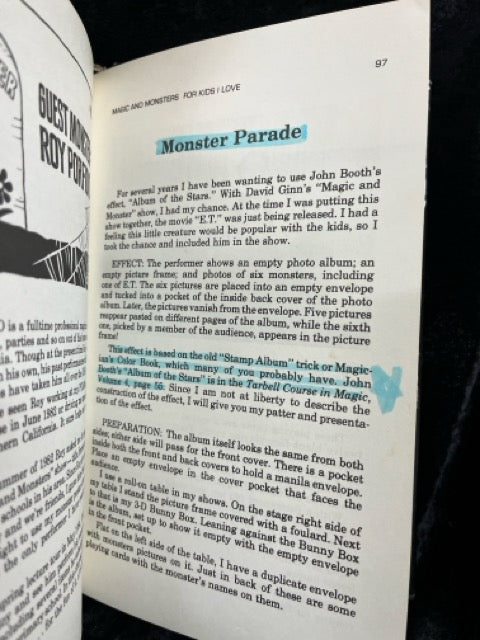 Based on his 1983 school show, Magic & Monsters, this 136 page HB book describes Halloween flavored magic for children. Highlight of the book is DRACULA’S COFFIN, a comedy routine with two kids, snakes popping out, and monster masks. Other routines include the Ghost Rabbit, Card Spider, King Kong Goes Bananas, 200 comedy lines & jokes with monsters, the Acupuncture Cabinet, Vampire Stuff, and David’s Guillotine routine performed in 500+ shows. Kids love this SPOOKY/COMEDY magic!