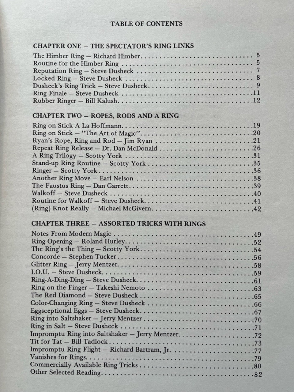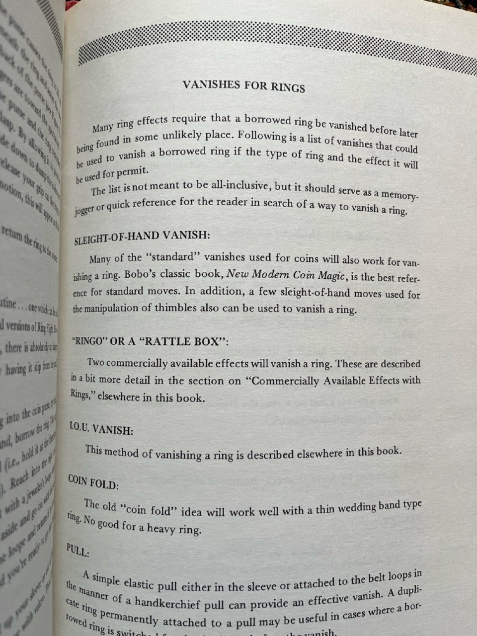 Magic with borrowed rings has special audience appeal because finger rings are important and valuable. They are extremely personal items. People show pride in themselves as well as love and affection toward others by the visible symbol of a finger-ring. Old-time stage magicians new the entertainment value of borrowing a ring, destroying it, and later producing it unharmed from inside a nest of boxes, an egg, or a walnut shell. Today's close-up performer can create similar audience interest by using that very "personal" item--a borrowed finger ring!