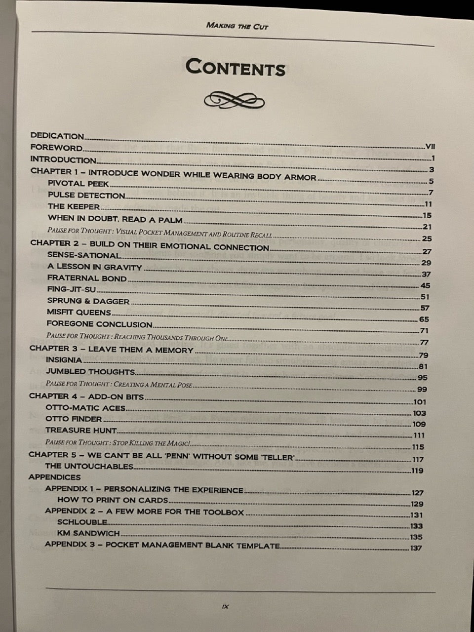 Making the Cut is stocked full of close up magic that will entertain and baffle laymen, as well as tricks that will make the magicians you know shake their heads. Ryan does a great job explaining the effects in the book and the illustrations make every move clear. In between the tricks, you will find Ryan's thoughts on performance, magic and some useful information for those who perform 'in the trenches.'